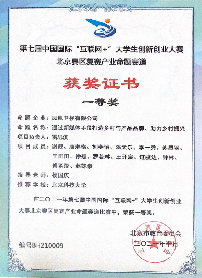 [16] 【三大赛获奖】2021年10月,“通过新媒体手段打造乡村与产品品牌、助力乡村振兴”参加第七届中国国际“互联网+”大学生创新创业大赛北京赛区复赛产业命题赛道,获省部级一等奖