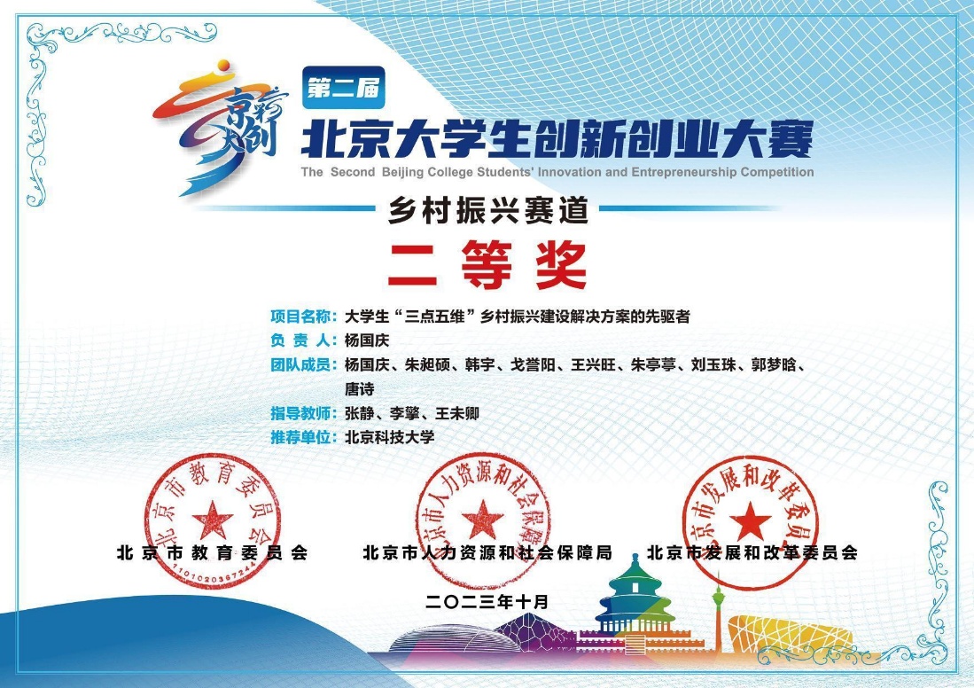 [30] 【其他竞赛获奖】2023年10月,“大学生‘三点五维’乡村振兴建设解决方案的先驱者”参加“京彩大创”第二届北京大学生创新创业大赛,获省部级二等奖