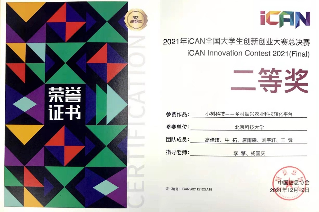 [10] 【其他竞赛获奖】2021年12月,“小树科技—乡村振兴农业科技转化平台”参加2021年iCAN全国大学生创新创业大赛总决赛,获国家级二等奖