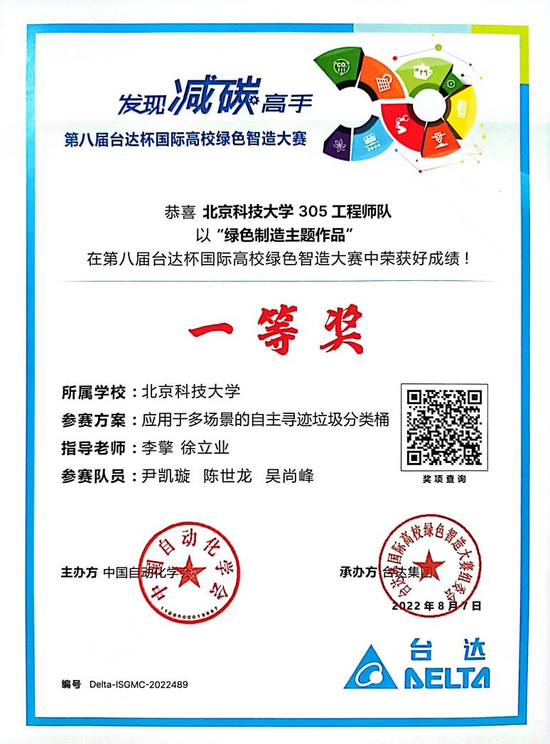 [8] 【其他竞赛获奖】2022年08月,“应用多场景的自主寻迹垃圾分类桶”参加第八届台达杯国际高校绿色智造大赛,获国家级一等奖