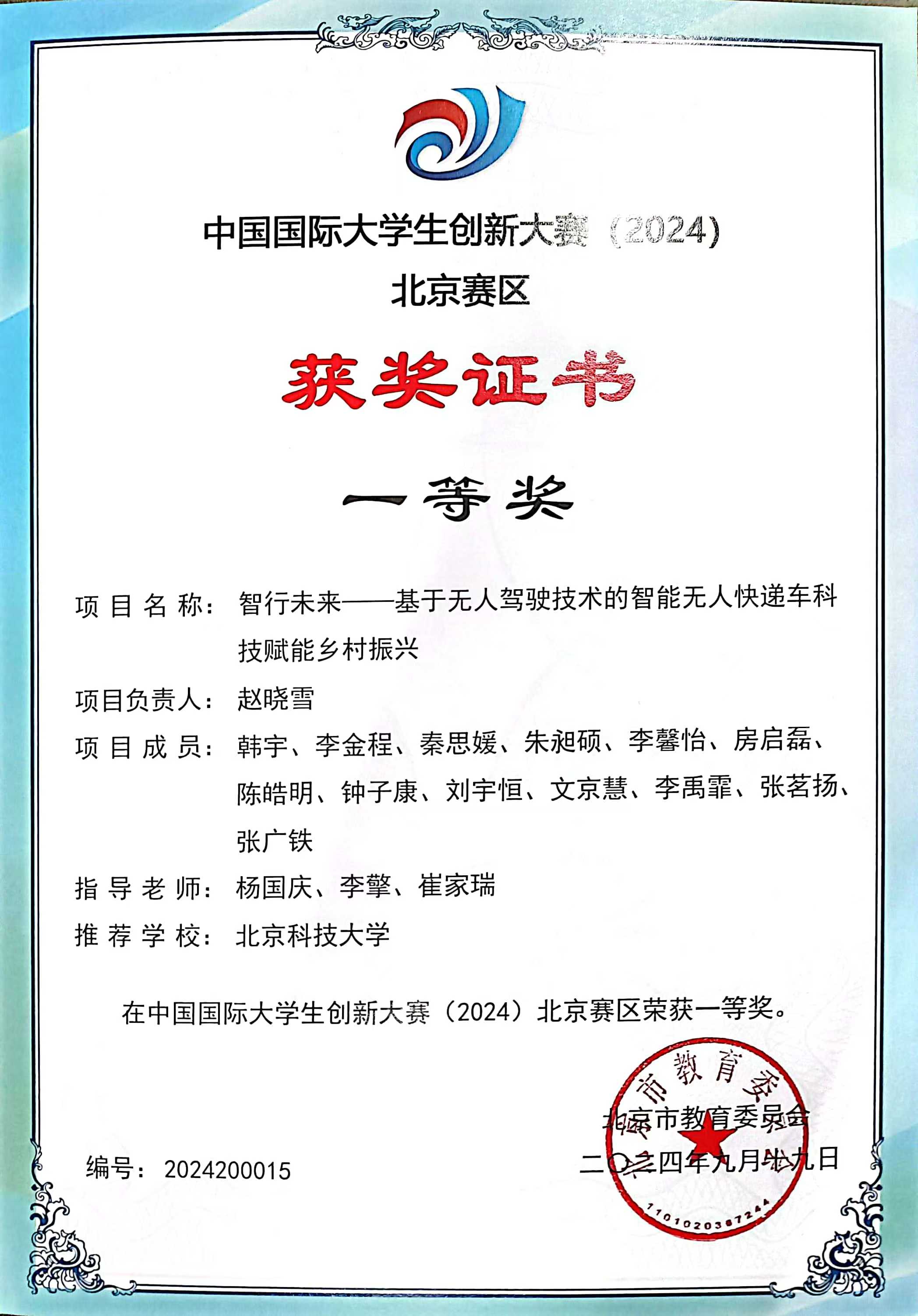 [14] 【三大赛获奖】2024年09月,“智行未来——基于无人驾驶技术的智能无人快递车科技赋能乡村振兴”参加中国国际大学生创新大赛北京赛区,获省部级一等奖