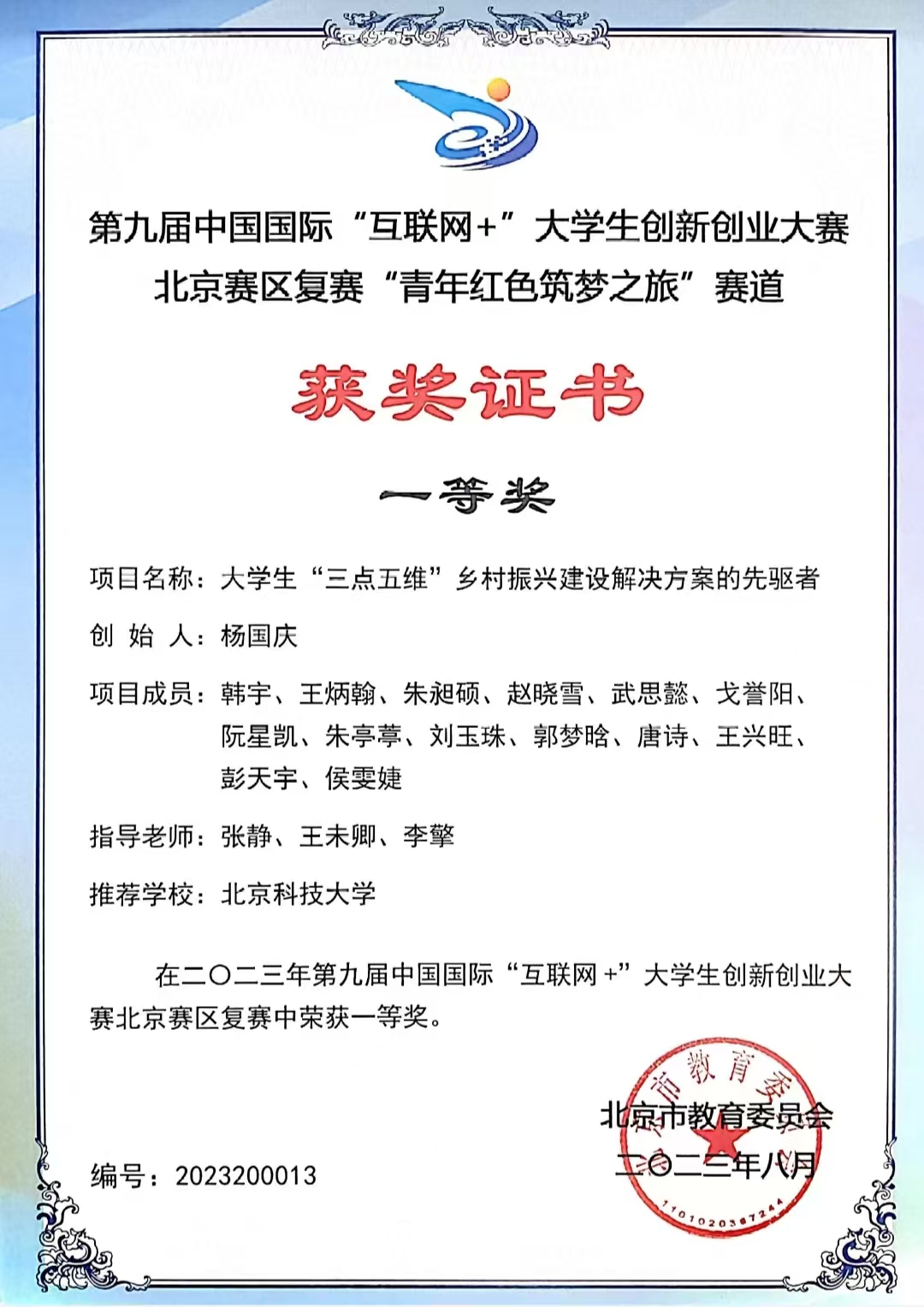 [15] 【三大赛获奖】2023年08月,“大学生‘三点五维’乡村振兴建设解决方案的先驱者”参加中国国际“互联网+”大学生创新创业大赛北京赛区复赛“青年红色筑梦之旅”赛道,获省部级一等奖