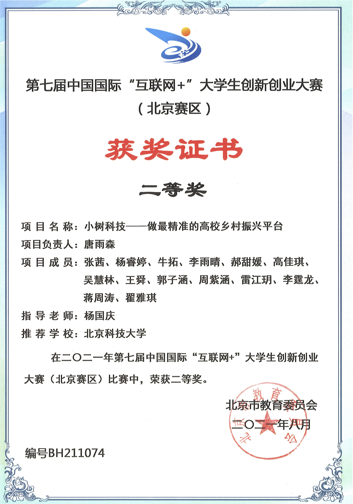 [23] 【三大赛获奖】2021年08月,“小树科技—做最精准的高校乡村振兴平台”参加第七届中国国际“互联网+”大学生创新创业大赛,获省部级二等奖