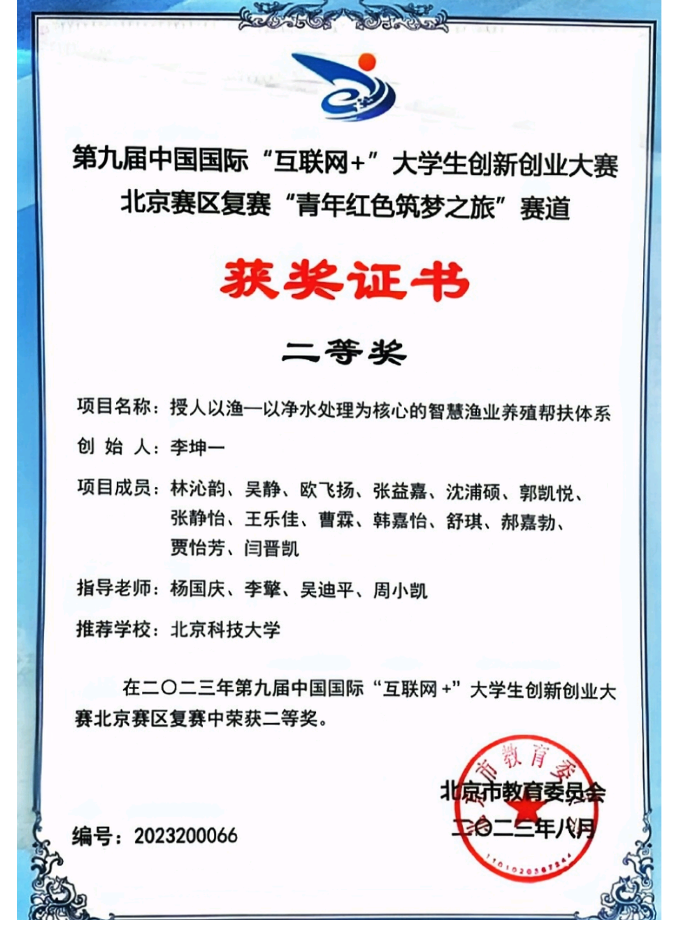 [22] 【三大赛获奖】2023年08月,“授人以渔—以净水处理为核心的智慧渔业养殖帮扶体系”参加第九届中国国际“互联网+”大学生创新创业大赛北京赛区复赛“青年红色筑梦之旅”赛道,获省部级二等奖