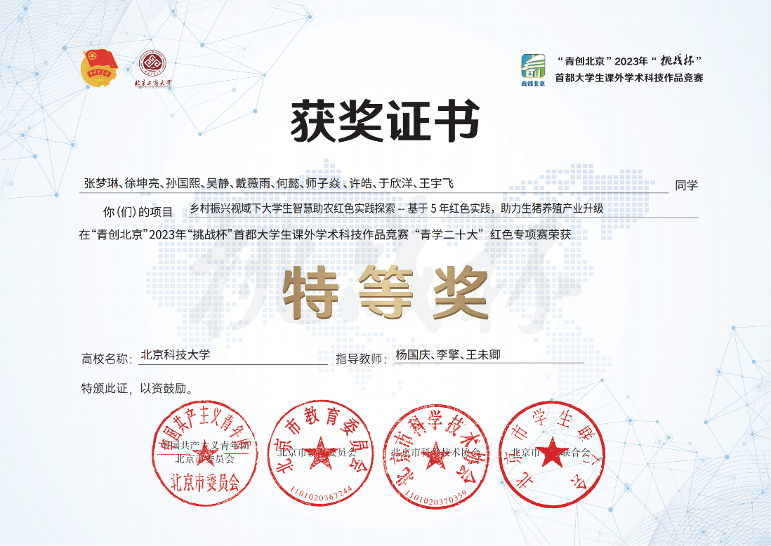 [11] 【三大赛获奖】2023年04月,“乡村振兴视域下大学生智慧助农红色实践探索—基于5年红色实践,助力生猪养殖产业升级”参加“青创北京”2023年“挑战杯”首都大学生课外学术科技作品竞赛“青学二十大”红色专项赛,获省部级特等奖