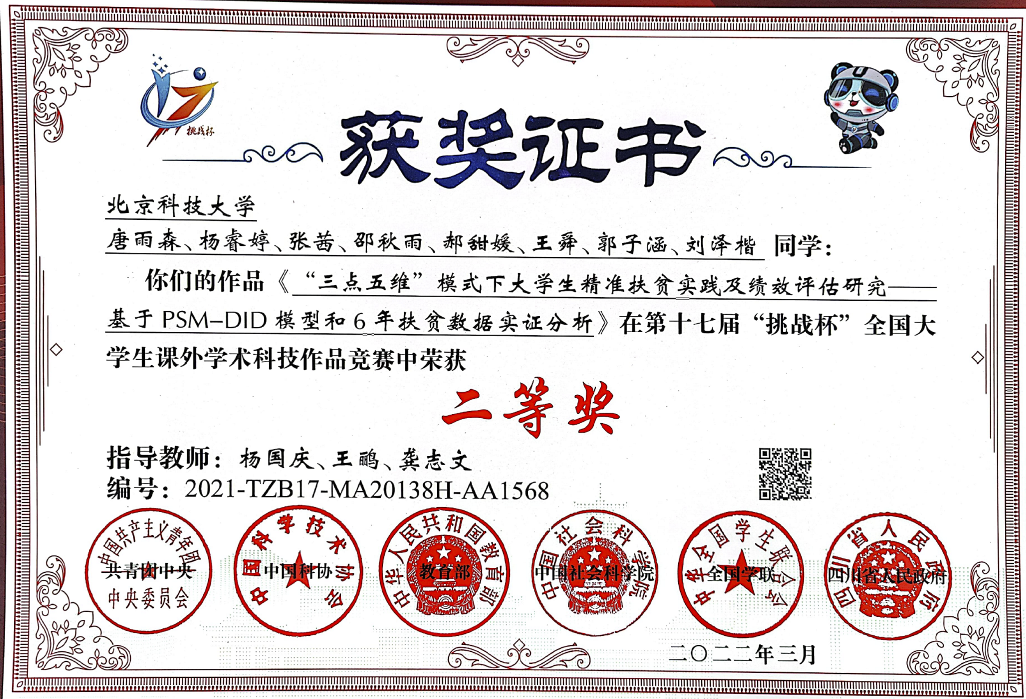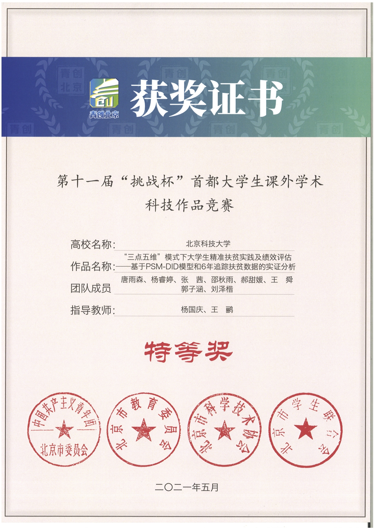 [4] 【三大赛获奖】2022年03月,“‘三点五维’模式下大学生精准扶贫实践及绩效评估研究——基于PSM-DID模型和6年扶贫数据市政分析”参加第十七届“挑战杯”全国大学生课外学术科技作品竞赛,获国家级二等奖,2021年05月,获省部级特等奖