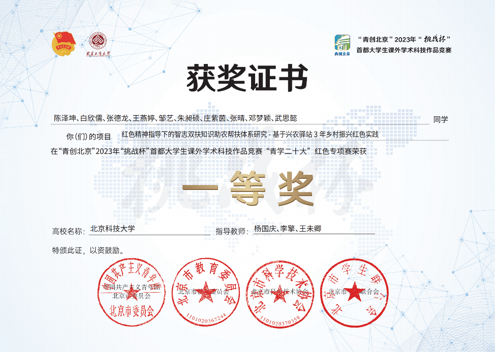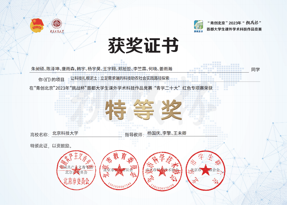 [12] 【三大赛获奖】2023年04月,“让科技扎根泥土:立足需求端的科技助农社会实践路径探索”参加“青创北京”2023年“挑战杯”首都大学生课外学术科技作品竞赛“青学二十大”红色专项赛,获省部级特等奖