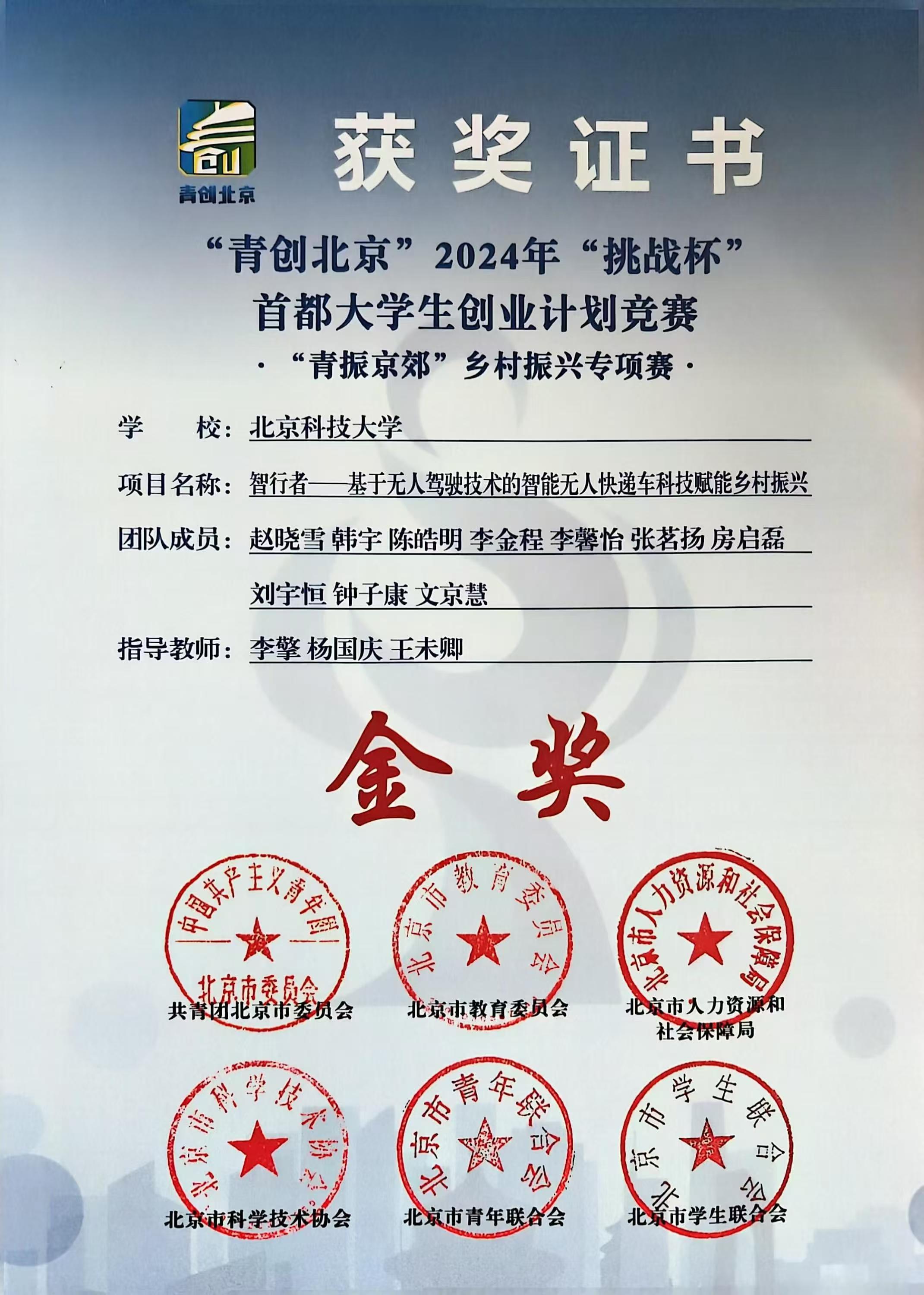 [20] 【三大赛获奖】2024年04月,“基于无人驾驶技术的智能无人快递车科技赋能乡村振兴”参加“青创北京”2024年“挑战杯”首都大学生创业计划竞赛主赛道,获省部级金奖