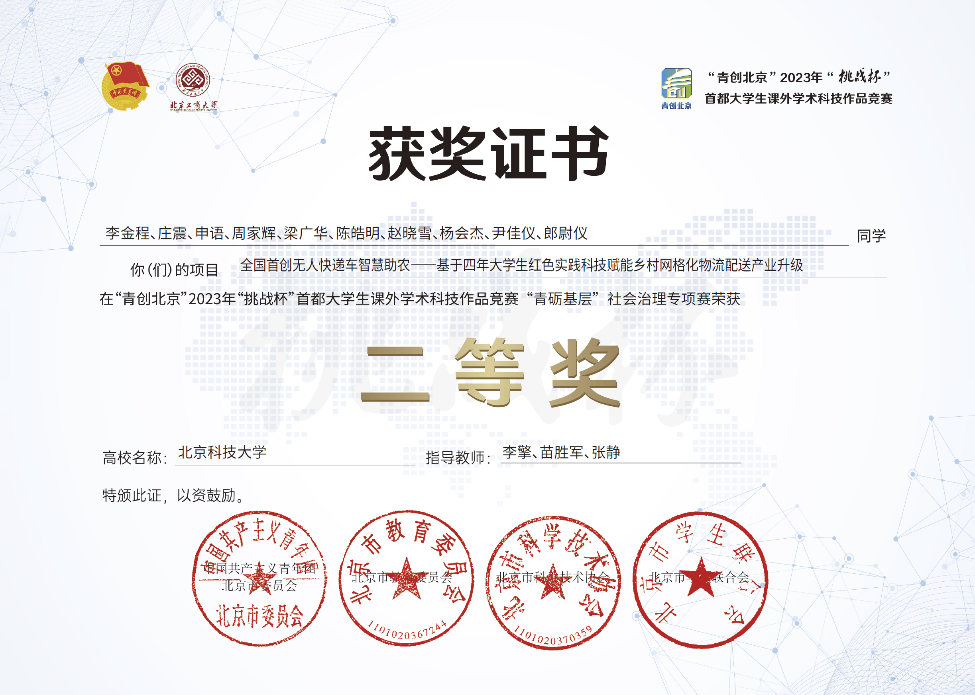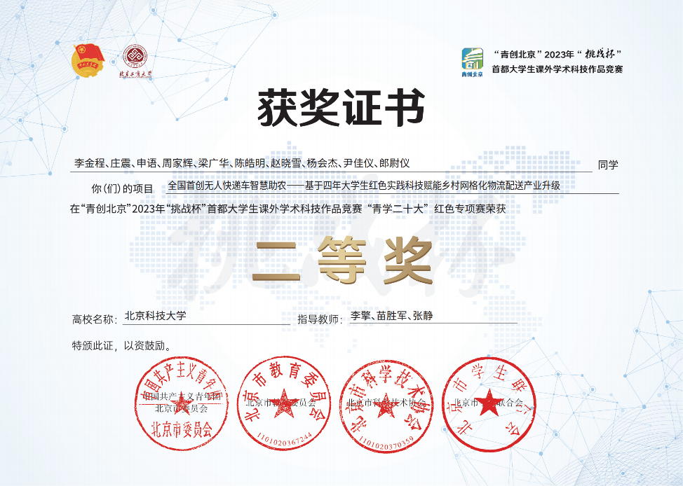 [24] 【三大赛获奖】2023年04月,“全国首创无人快递车智慧助农—基于四年大学生红色实践科技赋能乡村网格化物流配送产业升级”参加“青创北京”2023年“挑战杯”首都大学生课外学术科技作品竞赛“青学二十大”红色专项赛,获省部级二等奖