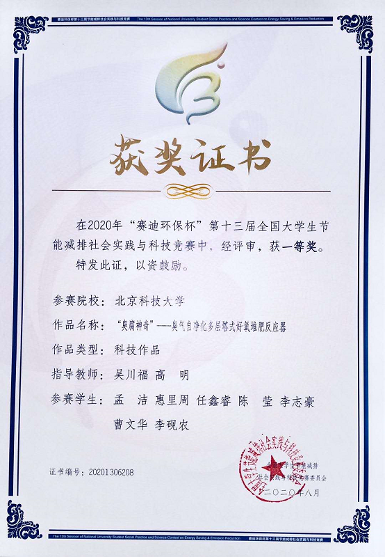 [9] 【其他竞赛获奖】2020年08月,“‘臭腐神奇’—臭气自净化多层搭式好氧堆肥反应器”参加“赛迪环保杯”第十三届全国大学生节能减排社会实践与科技竞赛,获国家级一等奖