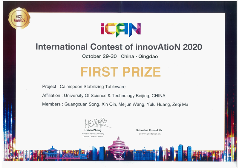 [6] 【其他竞赛获奖】2020年10月,“睿羹防抖餐具”参加第十四届iCAN国际创新创业大赛,获国际级一等奖