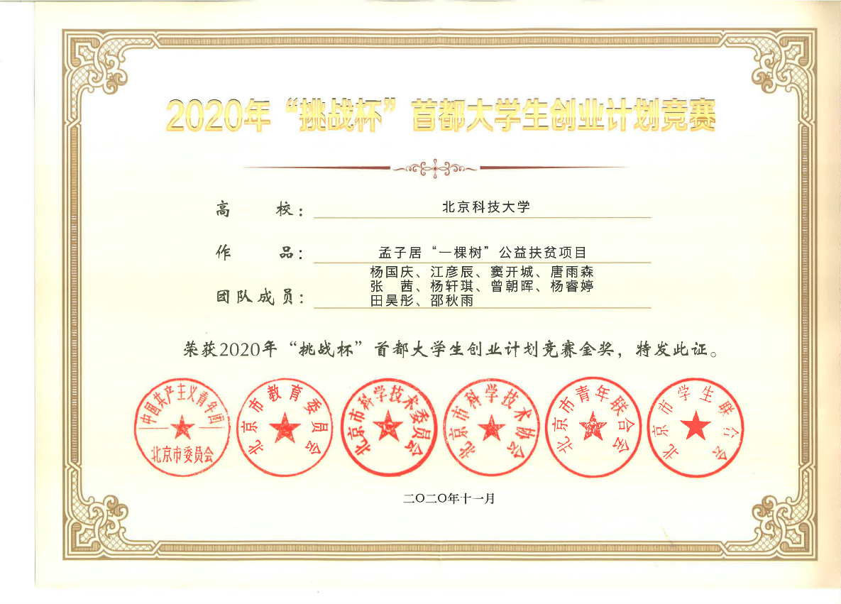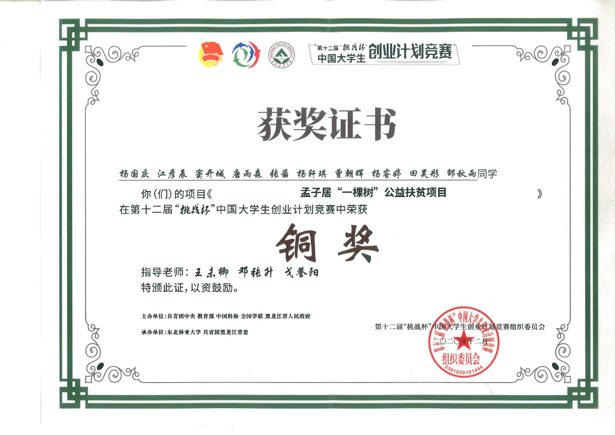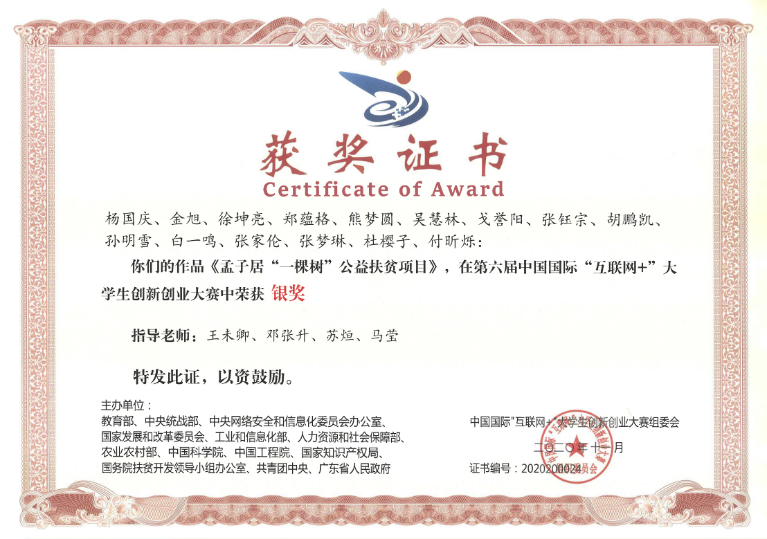 [2] 【三大赛获奖】2020年11月,“孟子居‘一棵树’公益扶贫项目”参加第六届中国国际“互联网+”大学生创新创业大赛,获国家级银奖;参加第十二届“挑战杯”中国大学生创业计划竞赛,获国家级铜奖和省部级金奖