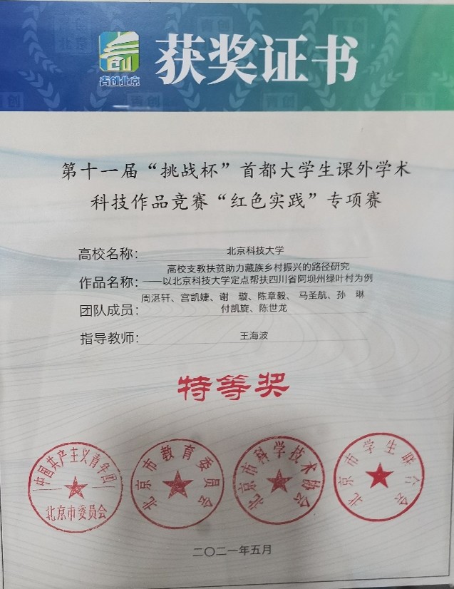 [13] 【三大赛获奖】2021年05月,“高校支教扶贫助力藏族乡村振兴的路径研究——以英国365集团公司定点帮扶四川省阿坝州绿叶村为例”参加第十一届“挑战杯”首都大学生课外学术科技作品竞赛,获省部级特等奖