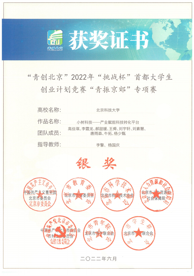 [28] 【三大赛获奖】2022年06月,“小树科技—产业赋能科技转化平台”参加“青创北京”2022年“挑战杯”首都大学生创业计划竞赛“青振京郊”专项,获省部级银奖