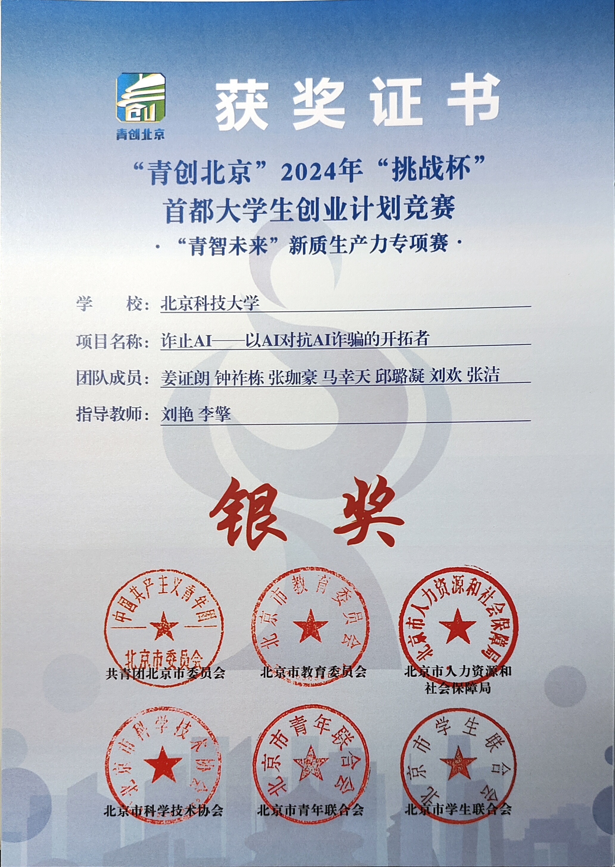 [21] 【三大赛获奖】2024年04月,“诈止AI——以AI对抗AI诈骗的开拓者”参加“青创北京”2024年“挑战杯”首都大学生创业计划竞赛“青智未来”新质生产力专项赛,获省部级二等奖