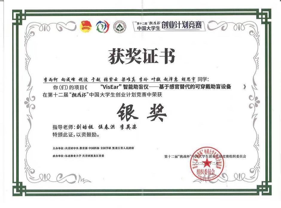 [5] 【三大赛获奖】2020年12月,“VisEar智能助盲仪——基于感官替代的可穿戴助盲设备”参加第十二届“挑战杯”中国大学生创业计划竞赛,获国家级银奖