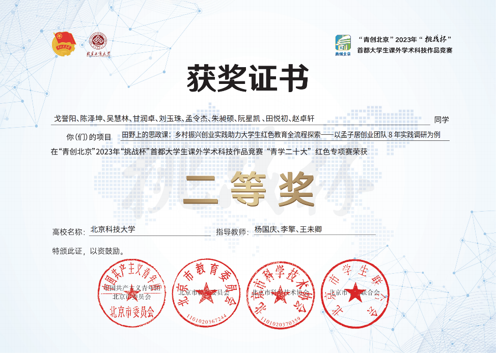 [26] 【三大赛获奖】2023年04月,“田野上的思政课:乡村振兴创业实践助力大学生红色教育全流程探索—以孟子居创业团队8年实践调研为例”参加“青创北京”2023年“挑战杯”首都大学生课外学术科技作品竞赛“青学二十大”红色专项赛,获省部级二等奖