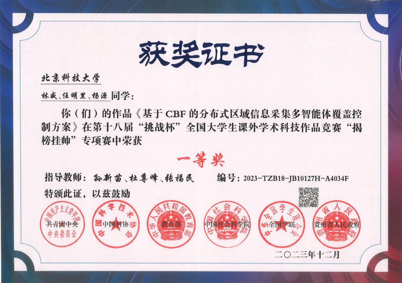 [1] 【三大赛获奖】2023年12月,“基于CBF的分布式区域信息采集多智能体覆盖控制方案”参加第十八届“挑战杯”全国大学生课外学术科技作品竞赛,获国家级一等奖