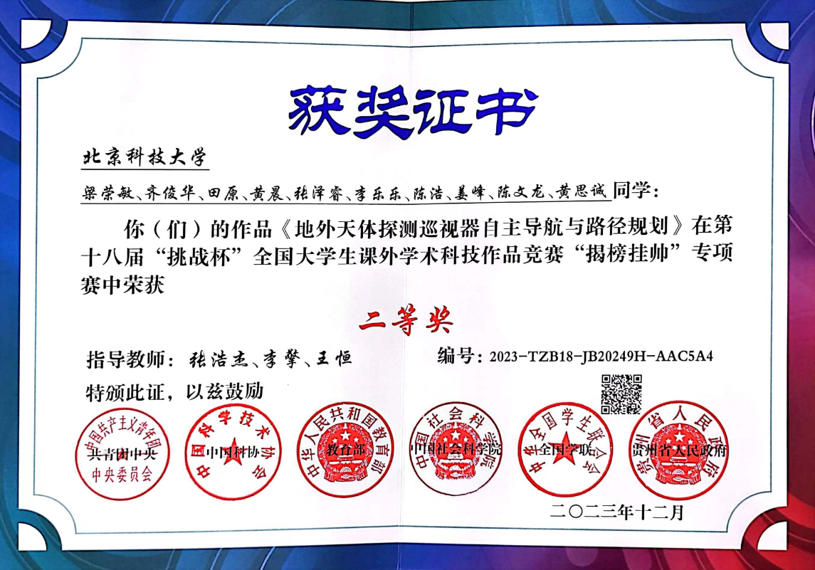 [3] 【三大赛获奖】2023年12月,“地外天体探测巡视器自主导航与路径规划”参加第十八届“挑战杯”全国大学生课外学术科技作品竞赛,获国家级二等奖