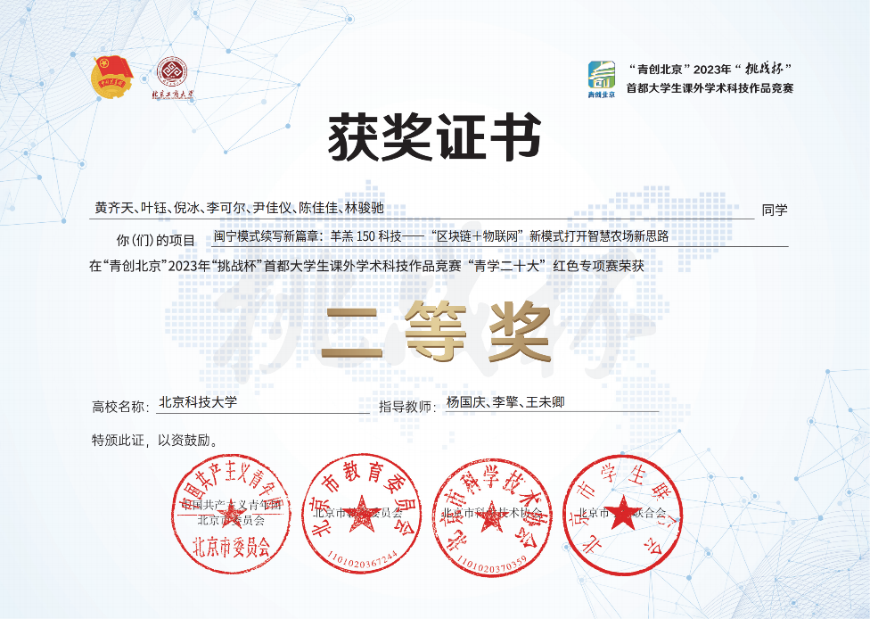 [25] 【三大赛获奖】2023年04月,“闽宁模式续写新篇章:羊羔150科技—‘区块链+物联网’新模式打开智慧农场新思路”参加“青创北京”2023年“挑战杯”首都大学生课外学术科技作品竞赛“青学二十大”红色专项赛,获省部级二等奖