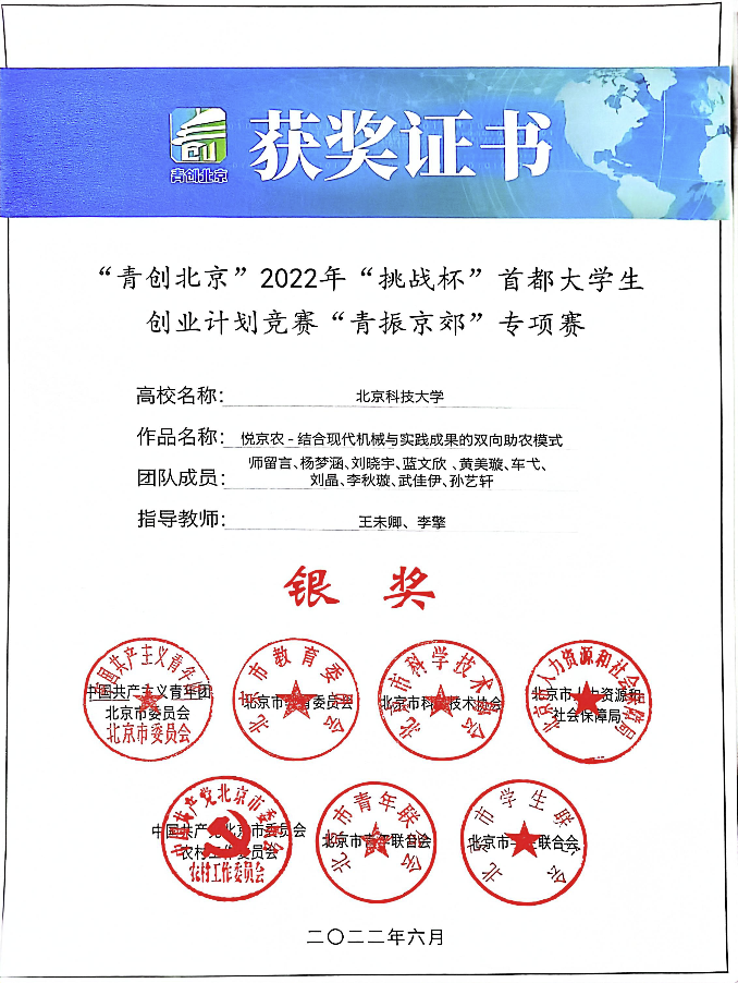 [29] 【三大赛获奖】2022年06月,“悦今农—结合现代机械与实践成果的双向助农模式”参加“青创北京”2022年“挑战杯”首都大学生创业计划竞赛“青振京郊”专项赛,获省部级银奖