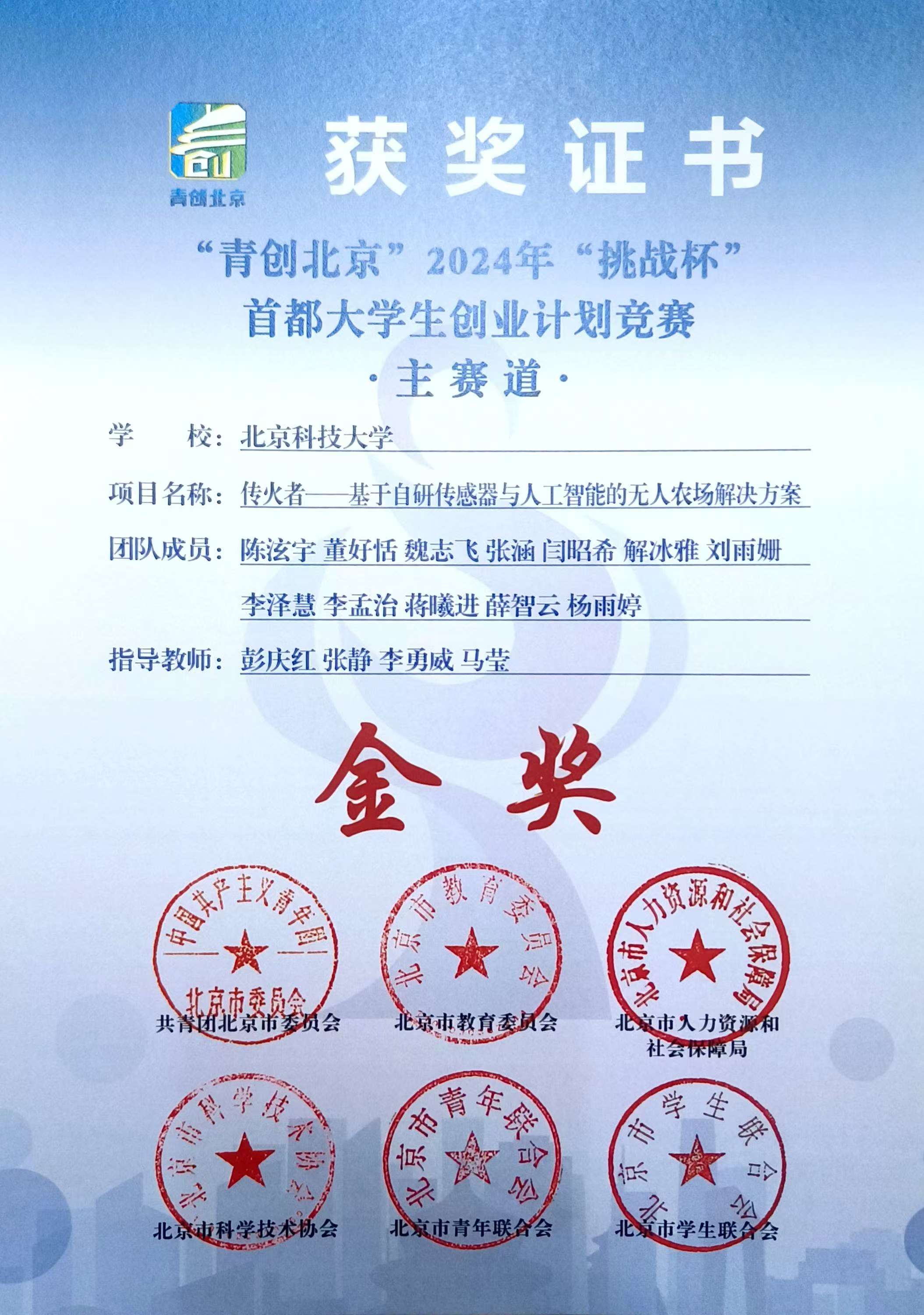 [19] 【三大赛获奖】2024年04月,“传火者—基于自研传感器与人工智能的无人农场解决方案”参加“青创北京”2024年“挑战杯”首都大学生创业计划竞赛主赛道,获省部级金奖