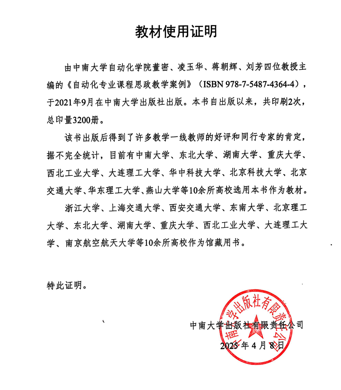 [2] 中南大学《自动化专业课程思政教学案例》教材使用证明
