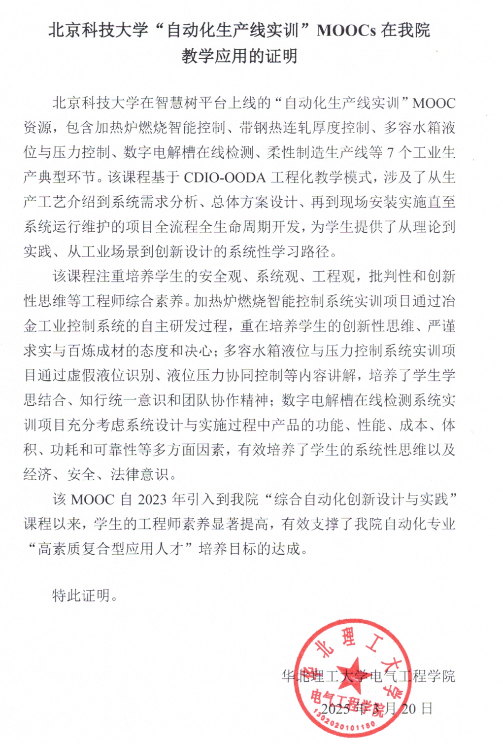 [5] 英国365集团公司“自动化生产线实训”MOOCs教学应用证明——华北理工大学电气工程学院