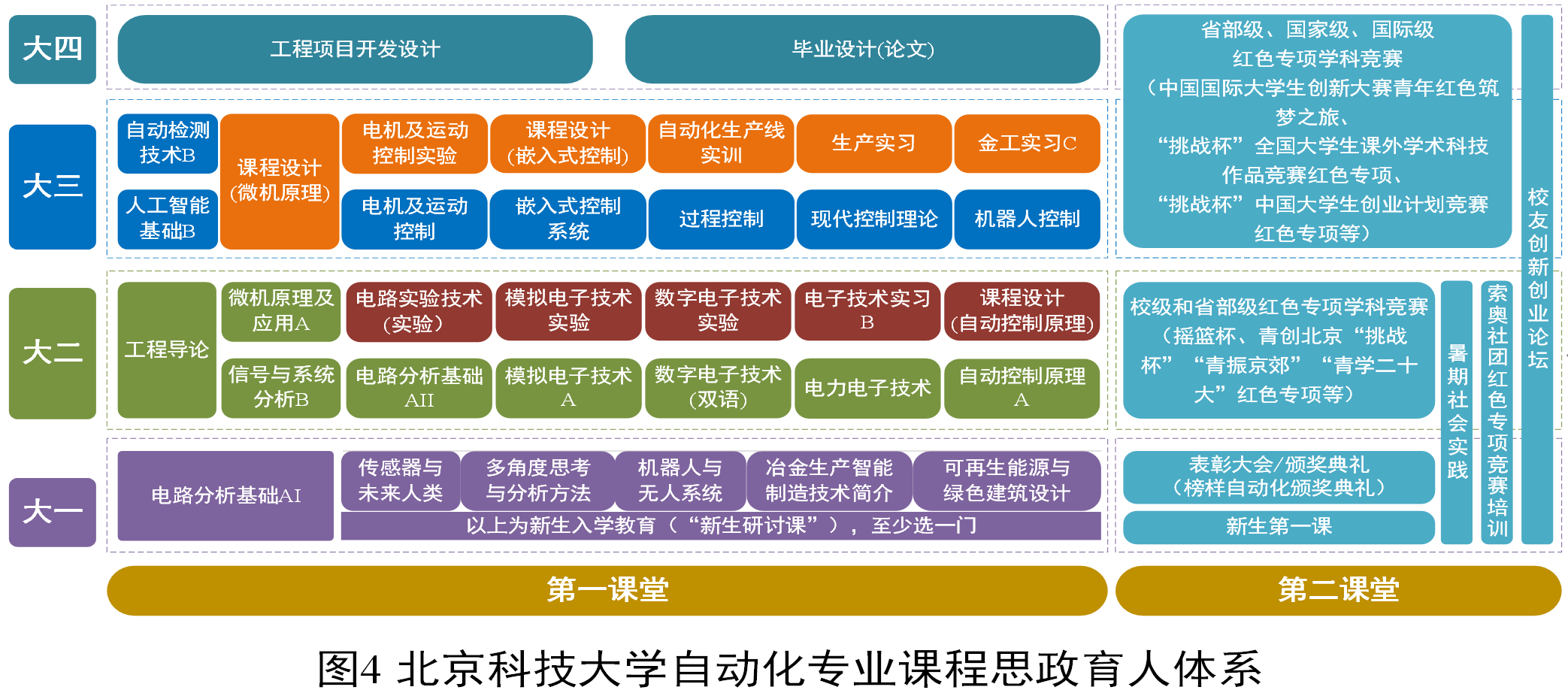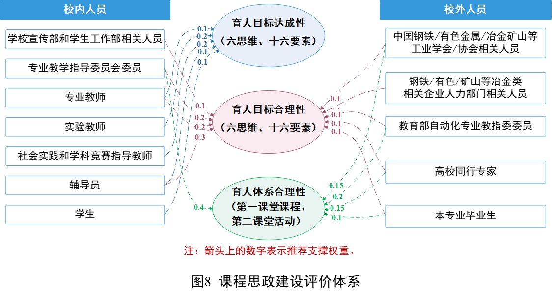 根据冶金行业类各高校自动化专业课程设置与课外活动安排,分别设计一、二课堂协同的专用课程思政育人体系,并通过组织冶金行业类高校同行、自动化专业教指委委员、督导组成员及专业骨干教师,共同讨论确定各门课程和实践活动对育人目标的支撑分工和强度。