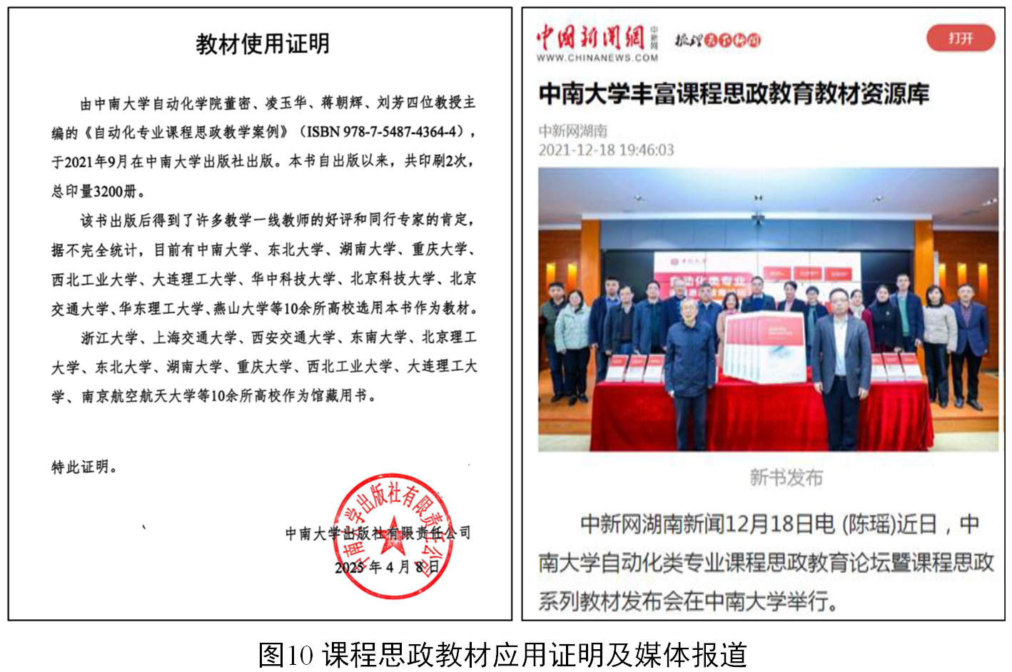 2)出版《自动化专业课程思政教学案例》等课程思政教材2部、融入课程思政内容的其他教材8部,已推广到浙江大学、湖南大学、重庆大学、大连理工大学等20余所高校,并受到中国新闻网、湖南日报等主流媒体报道。