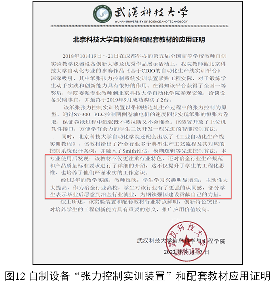 4)自主研发了融入冶金行业生产规范和产品质量标准等要求的设备8类30余台套。其中,张力控制实训装置和配套教材已推广到武汉科技大学等2所冶金行业高校。