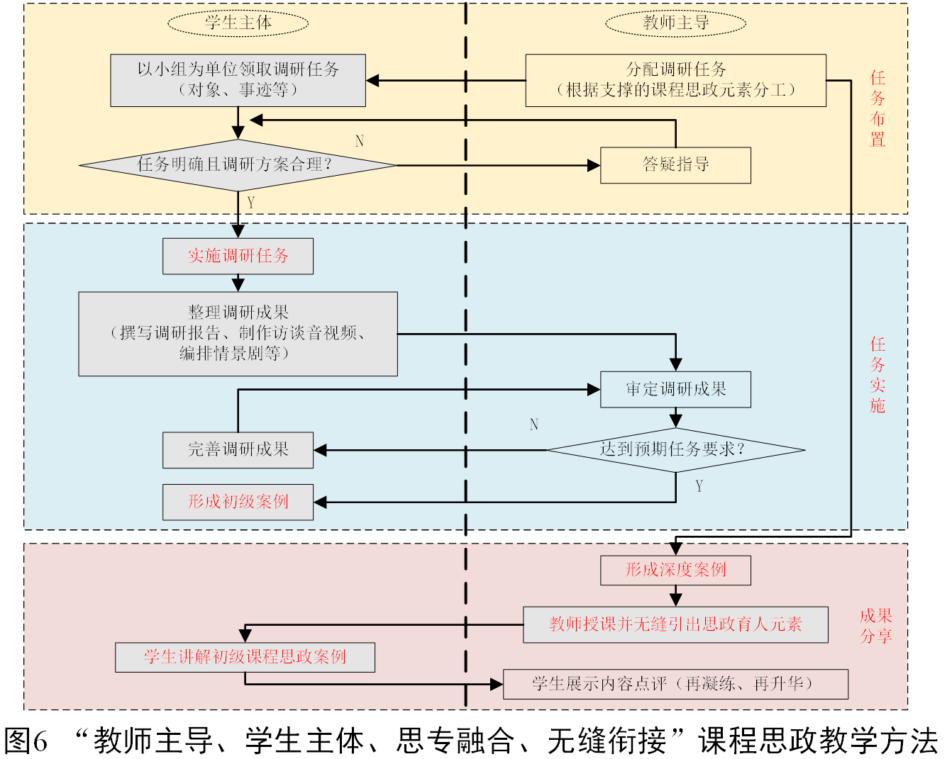 ①提出了“教师主导、学生主体、思专融合、无缝衔接”课程思政教学方法,具体流程如图6所示。
