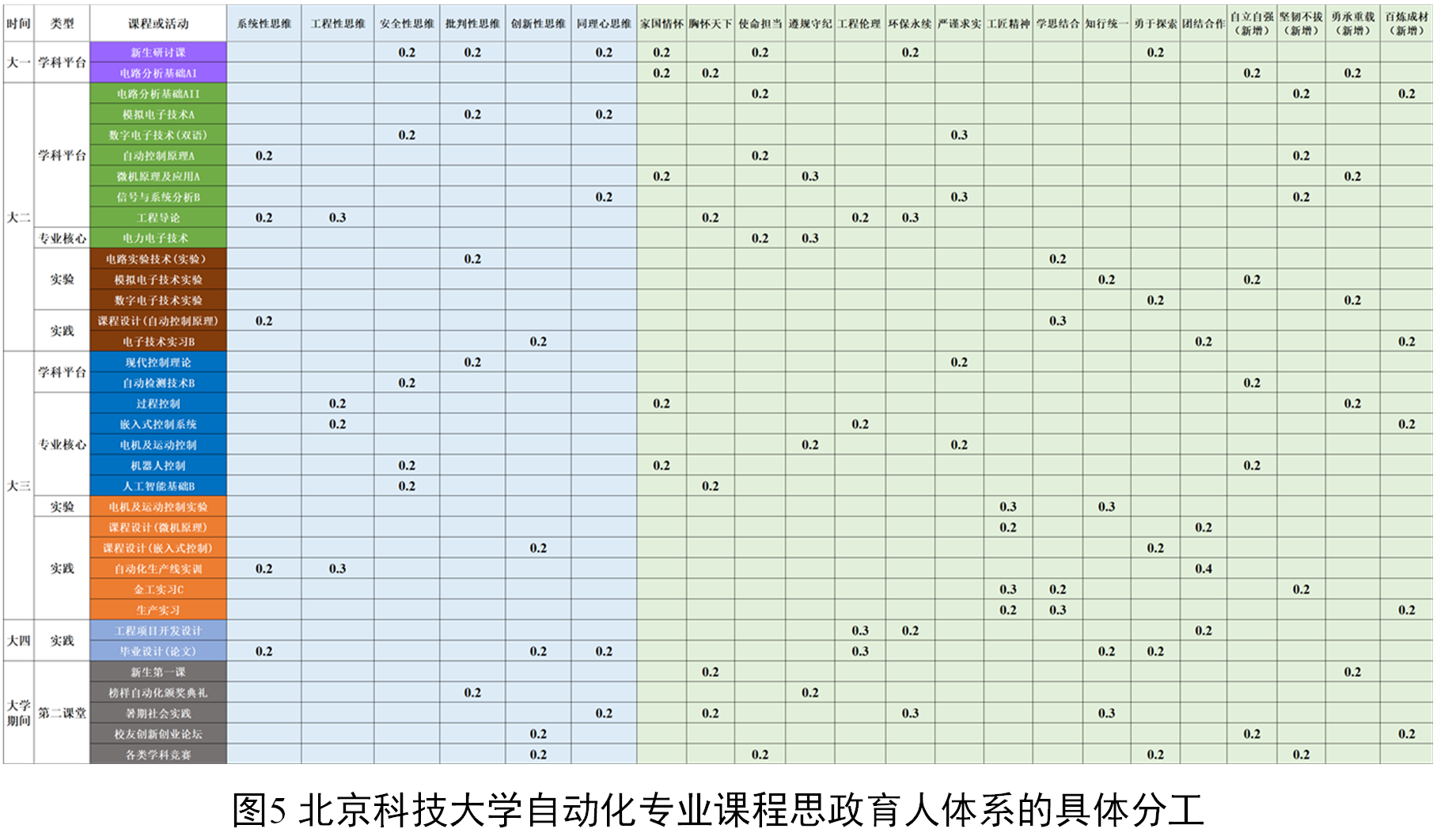 ②构建了一二课堂有机协同的专用育人体系,分工各育人目标的支撑课程(或活动)并分配支撑强度。设计的北科大自动化专业的课程思政育人体系及课程对育人目标的支撑情况分别如图4和图5所示。