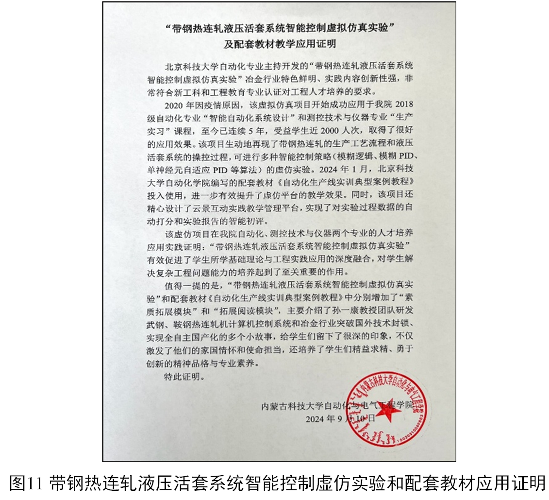 3)开发了融入课程思政案例的虚仿实验4个。其中,融入孙一康教授工匠精神、工程伦理和行业规范等思政案例的“带钢热连轧液压活套系统智能控制虚拟仿真实验和配套教材已被内蒙古科技大学自动化专业和测控技术与仪器专业应用。