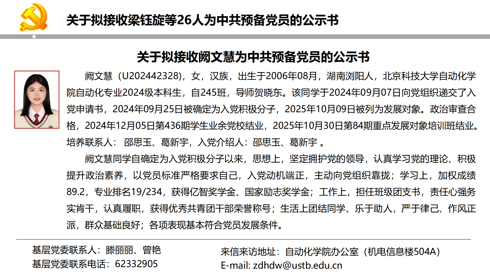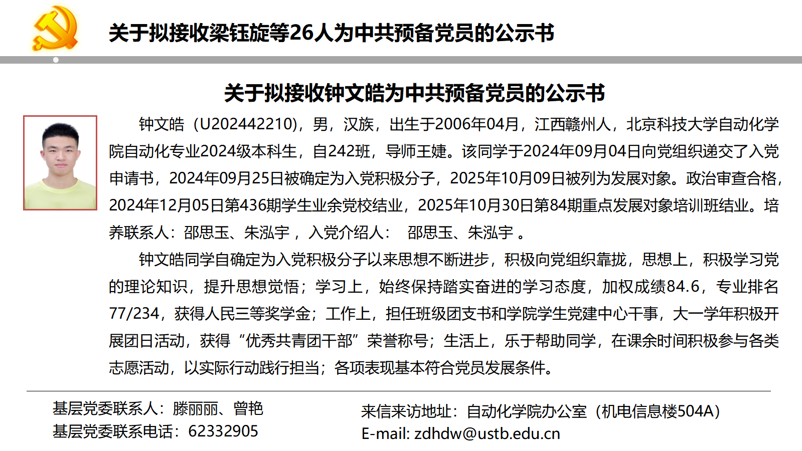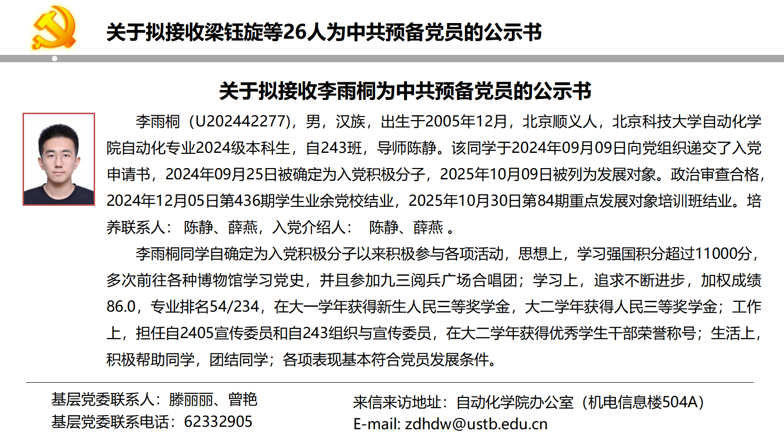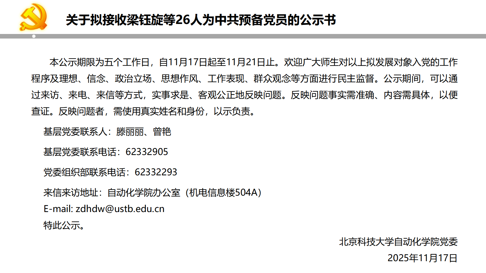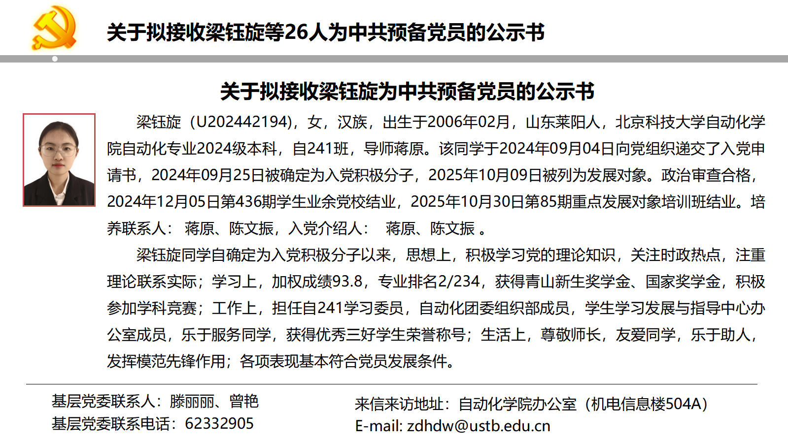 关于拟接收梁钰旋等26人为中共预备党员的公示书