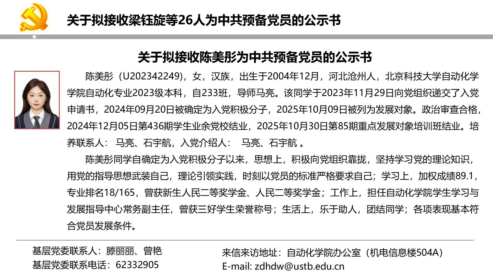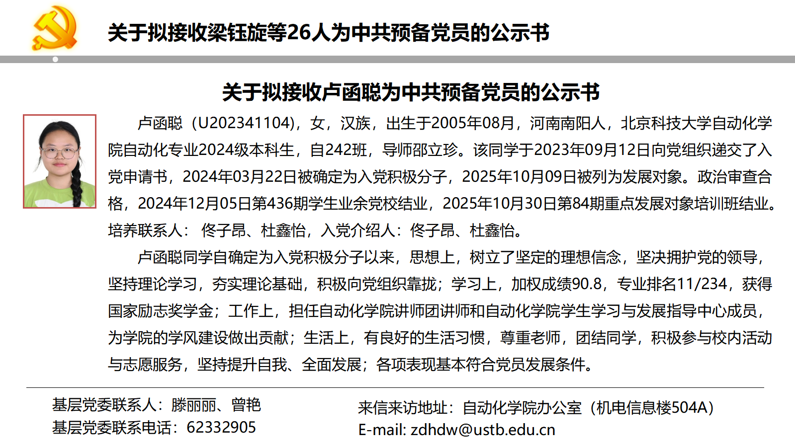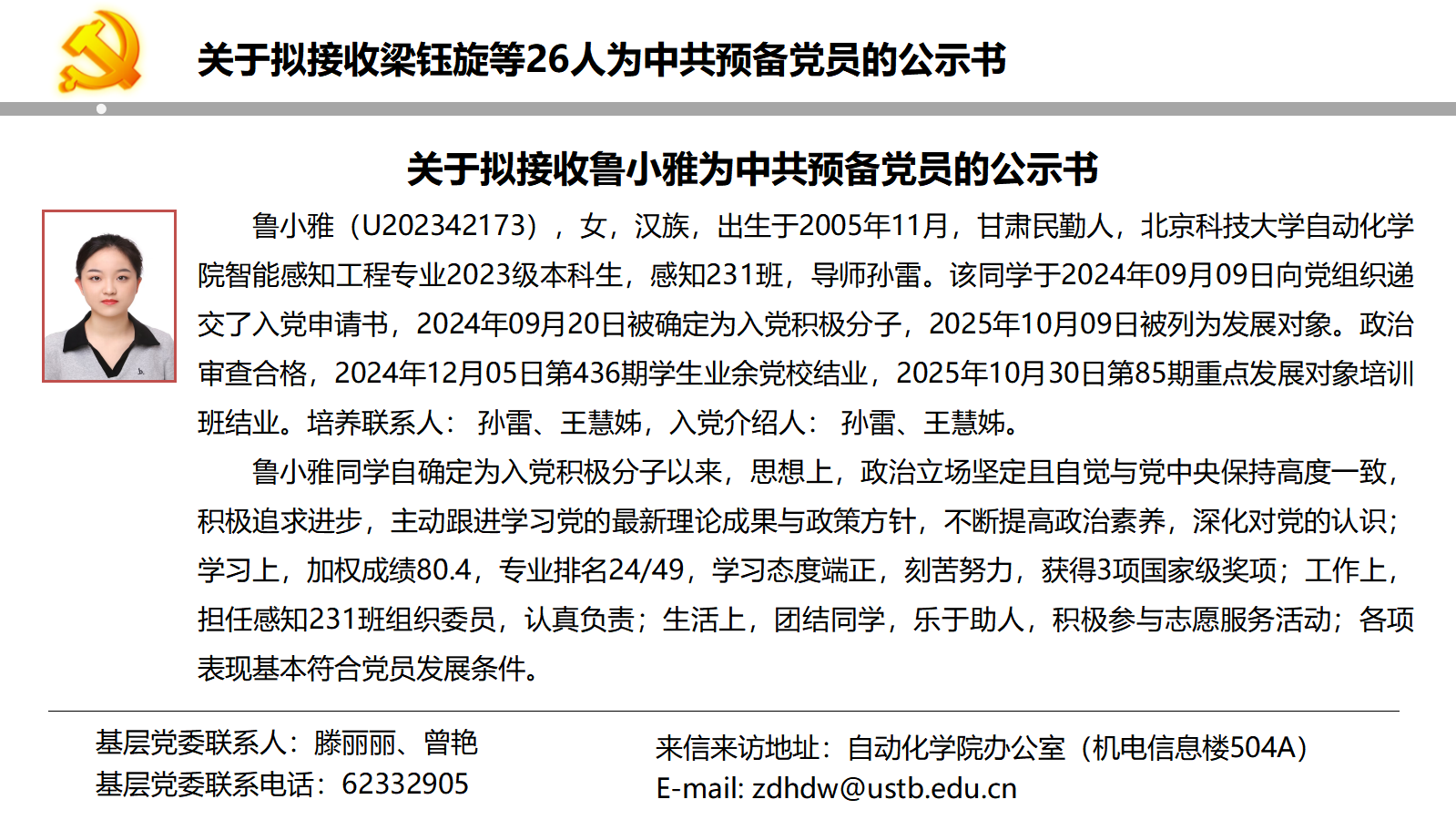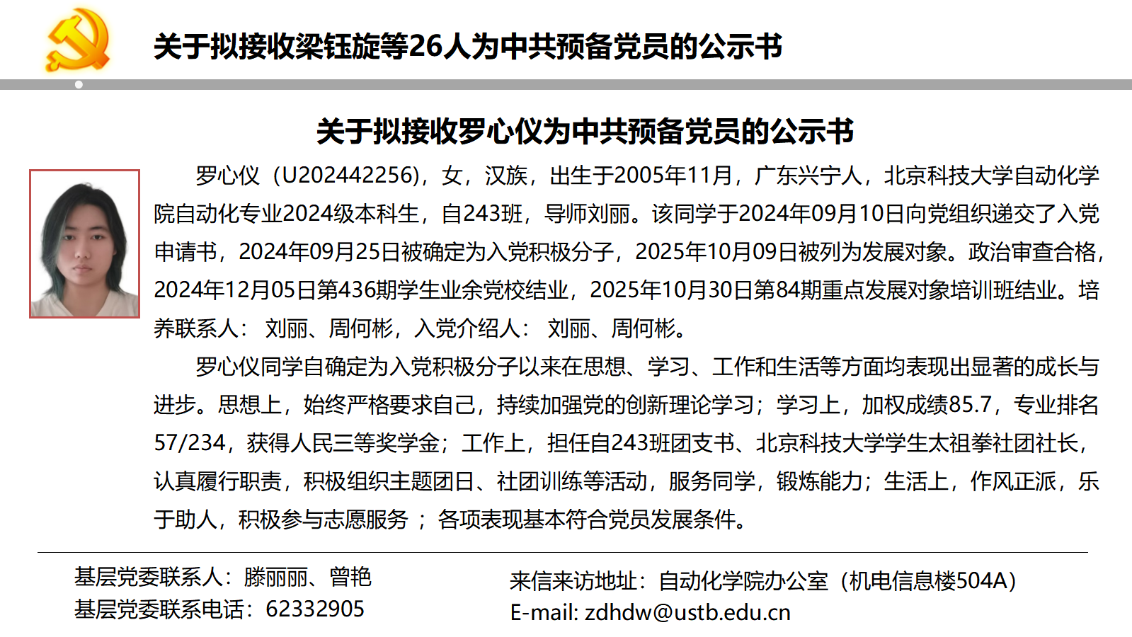 关于拟接收梁钰旋等26人为中共预备党员的公示书