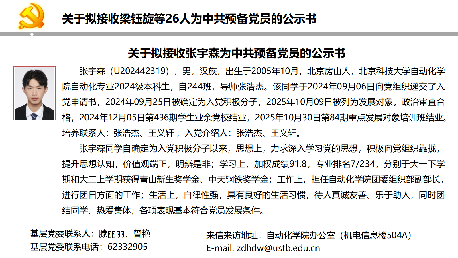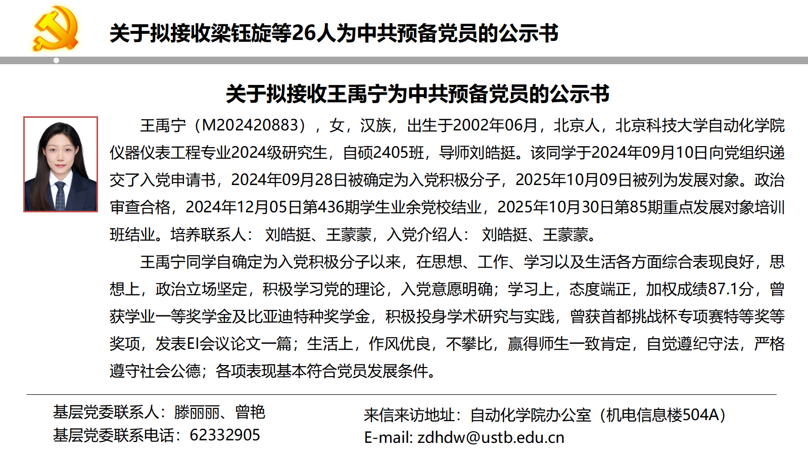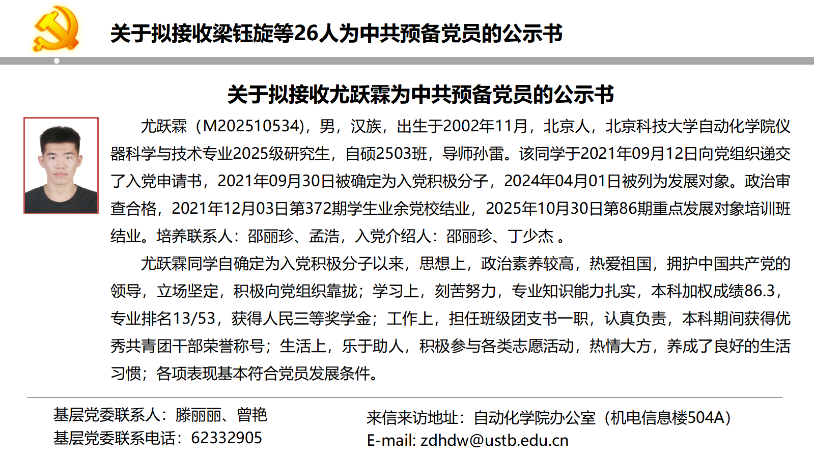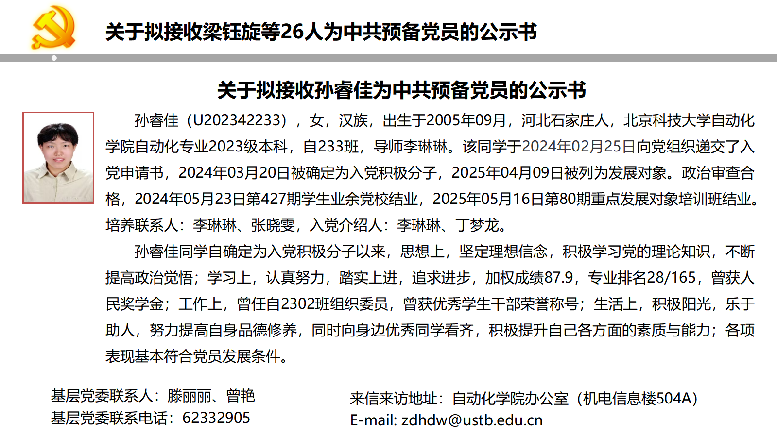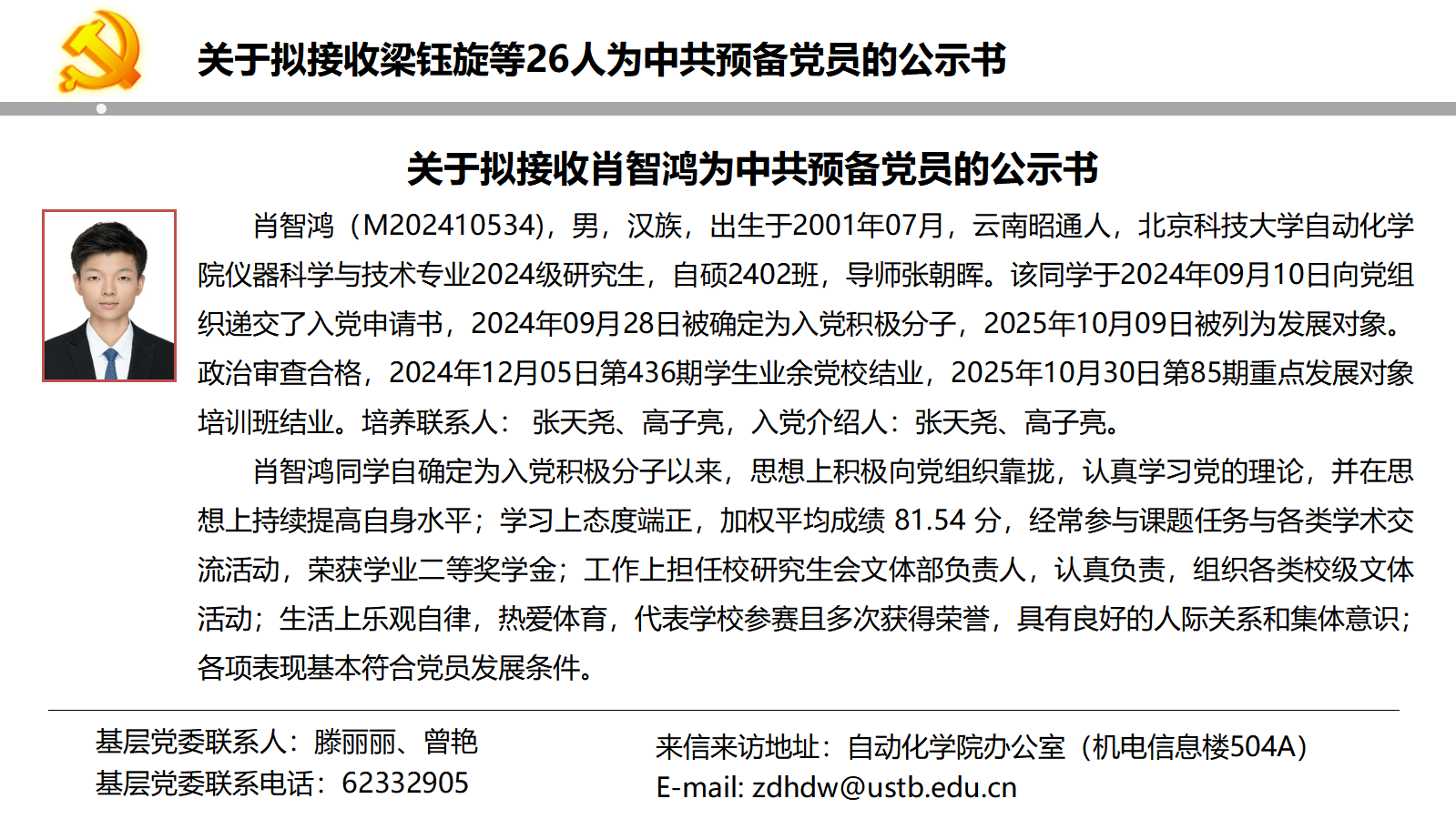 关于拟接收梁钰旋等26人为中共预备党员的公示书