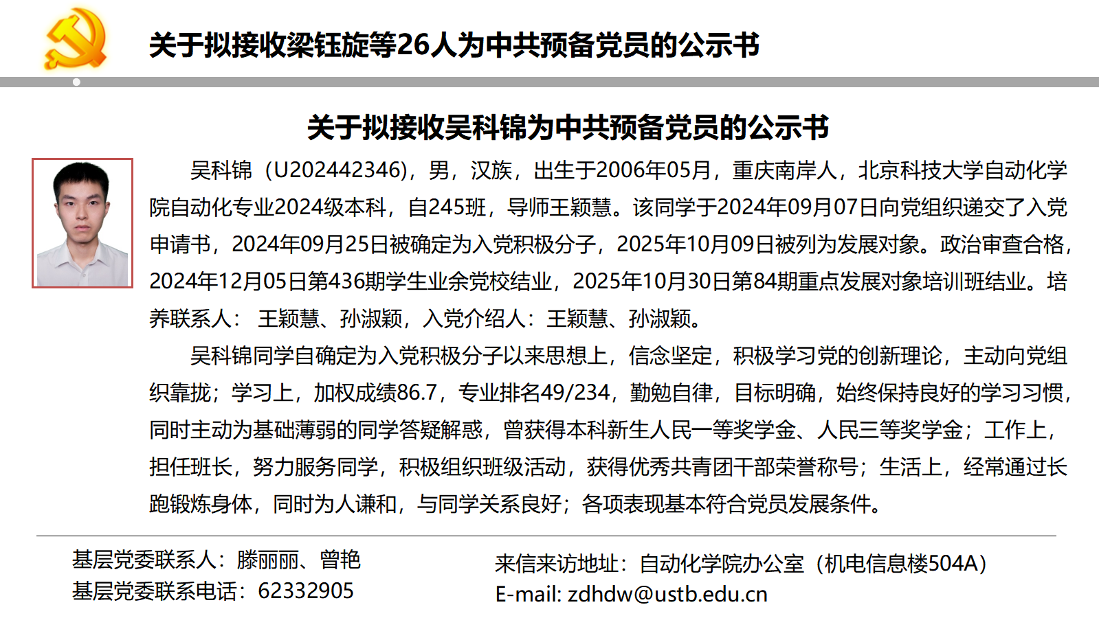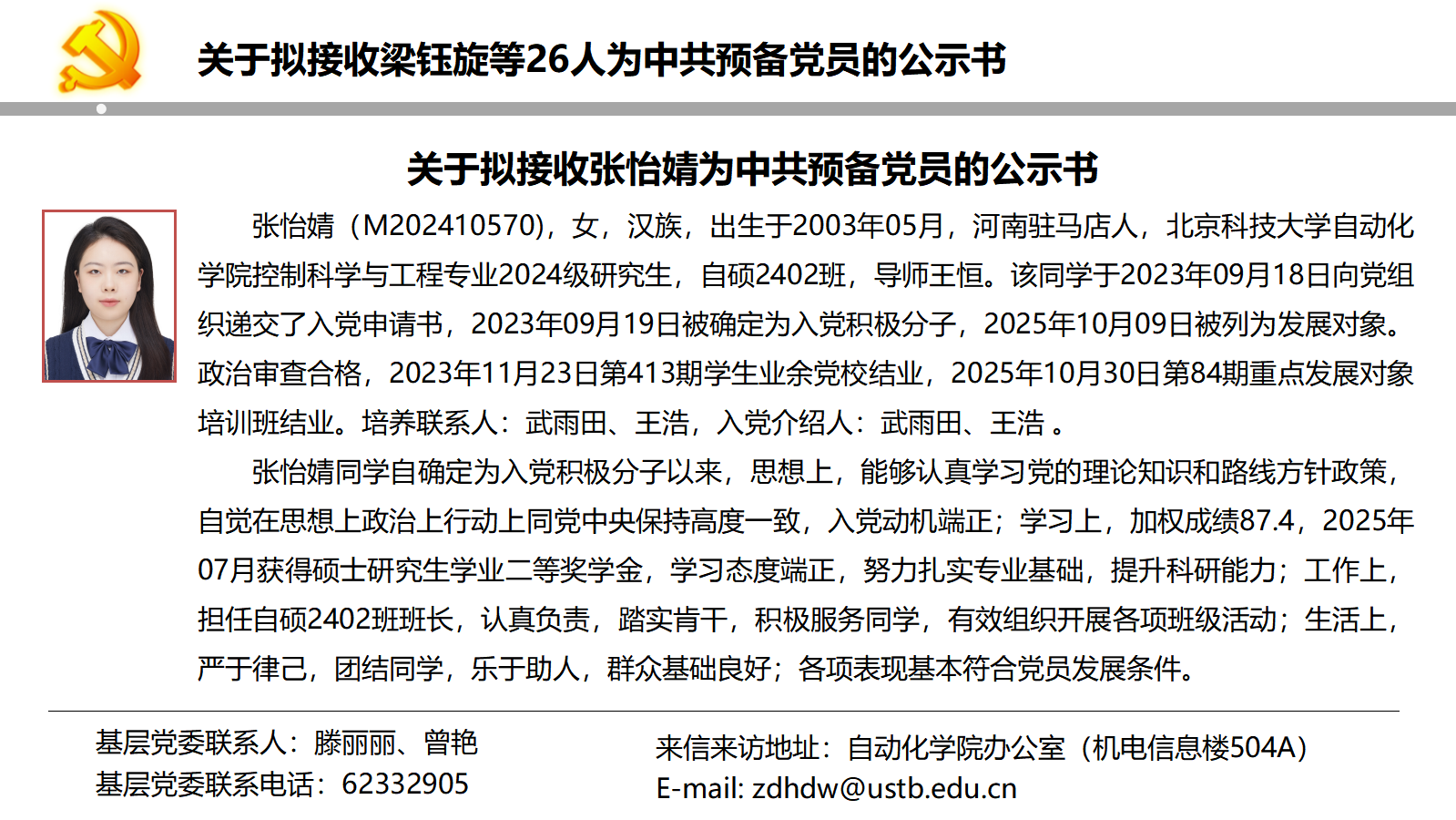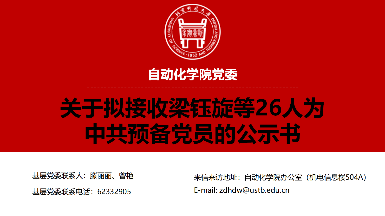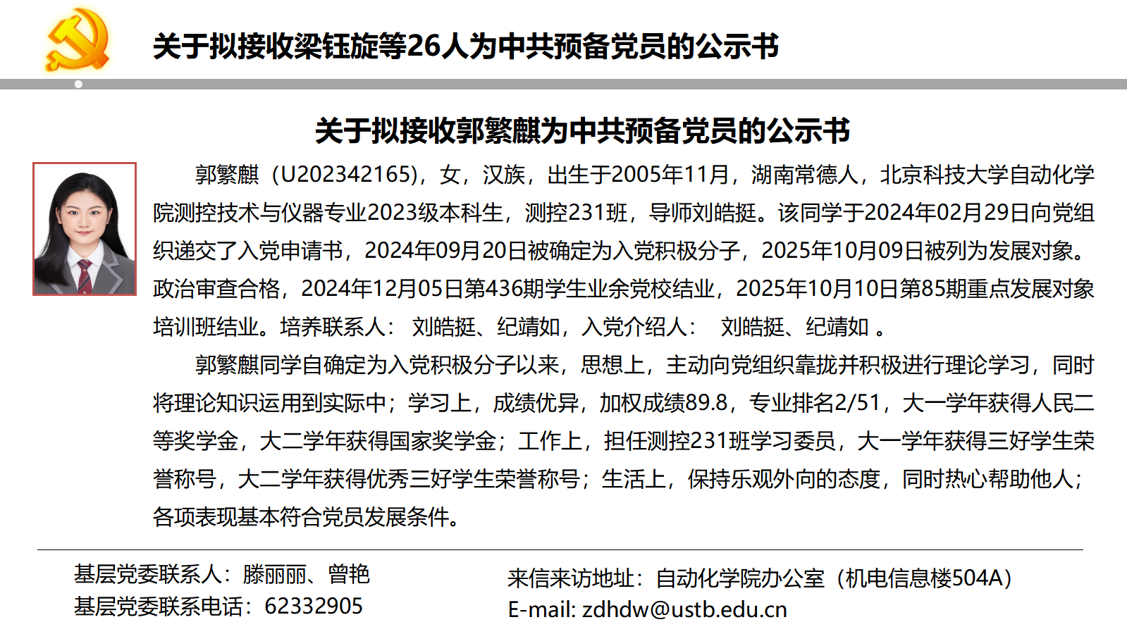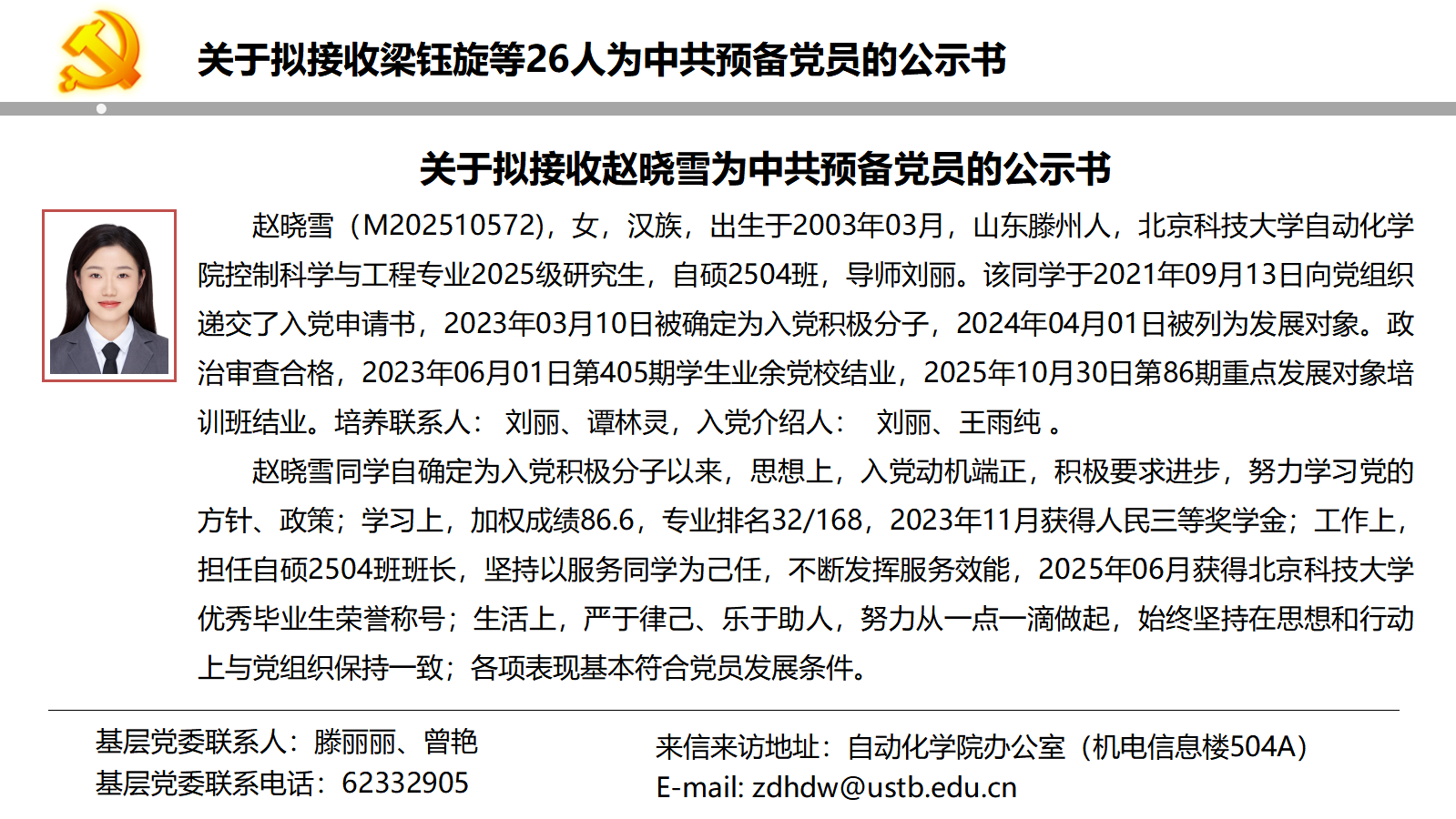 关于拟接收梁钰旋等26人为中共预备党员的公示书