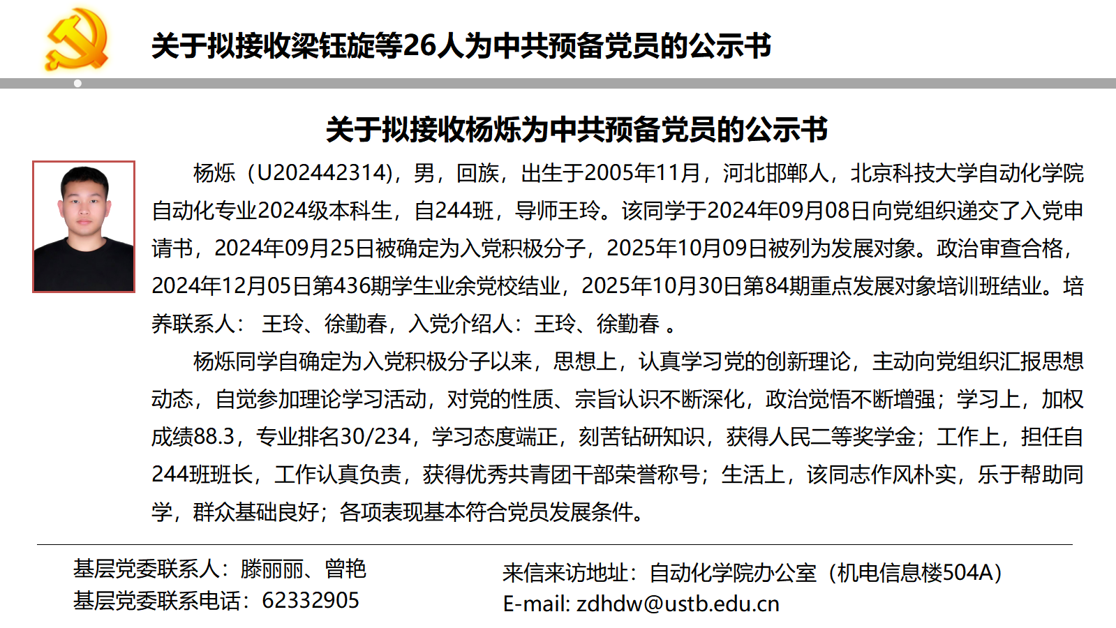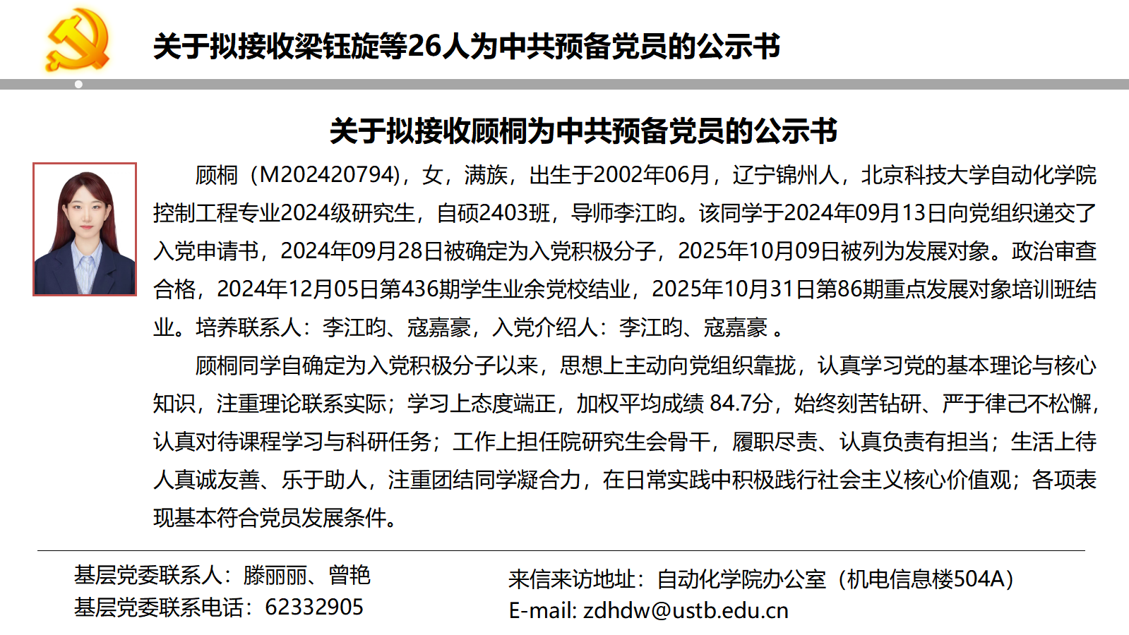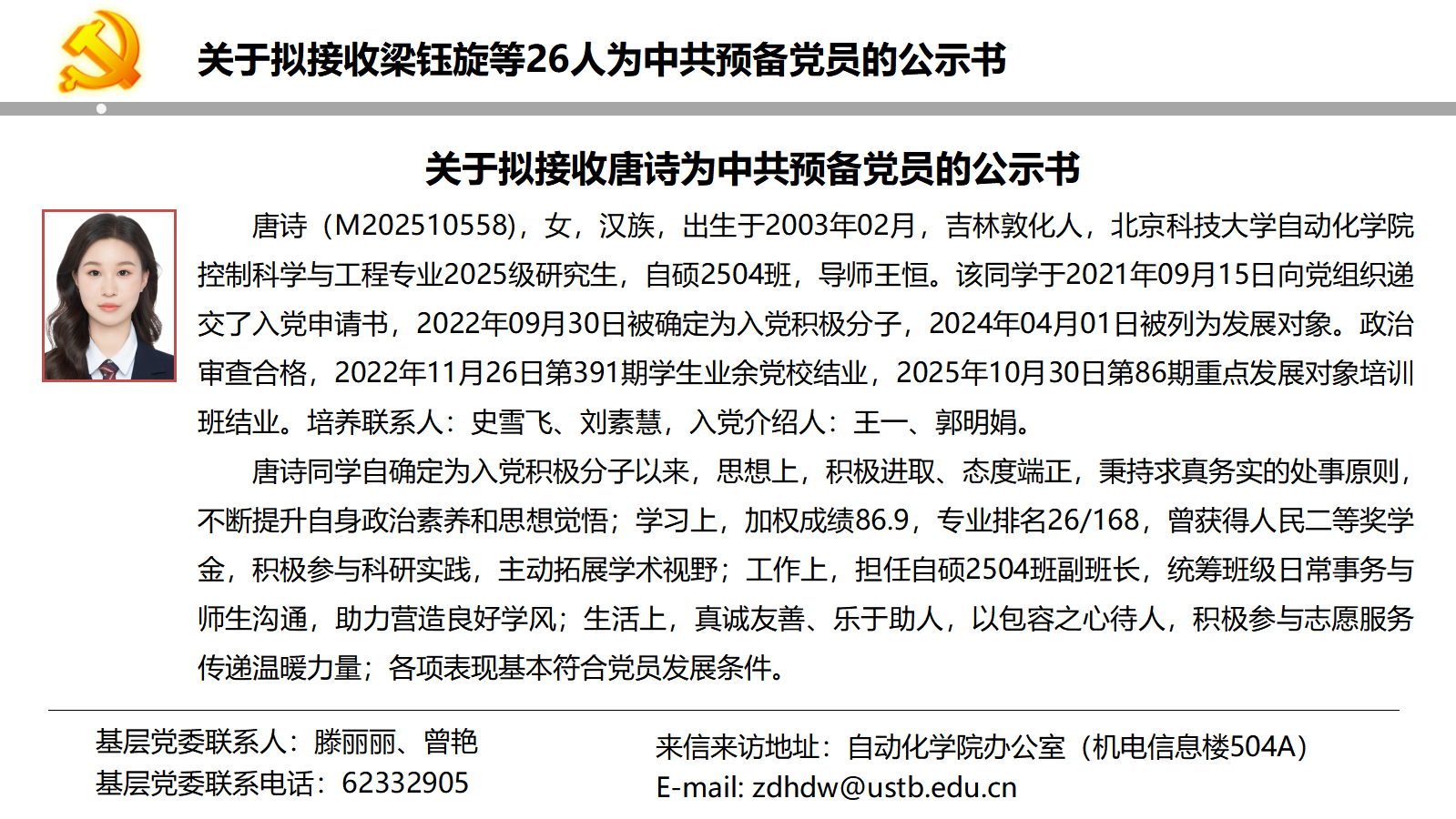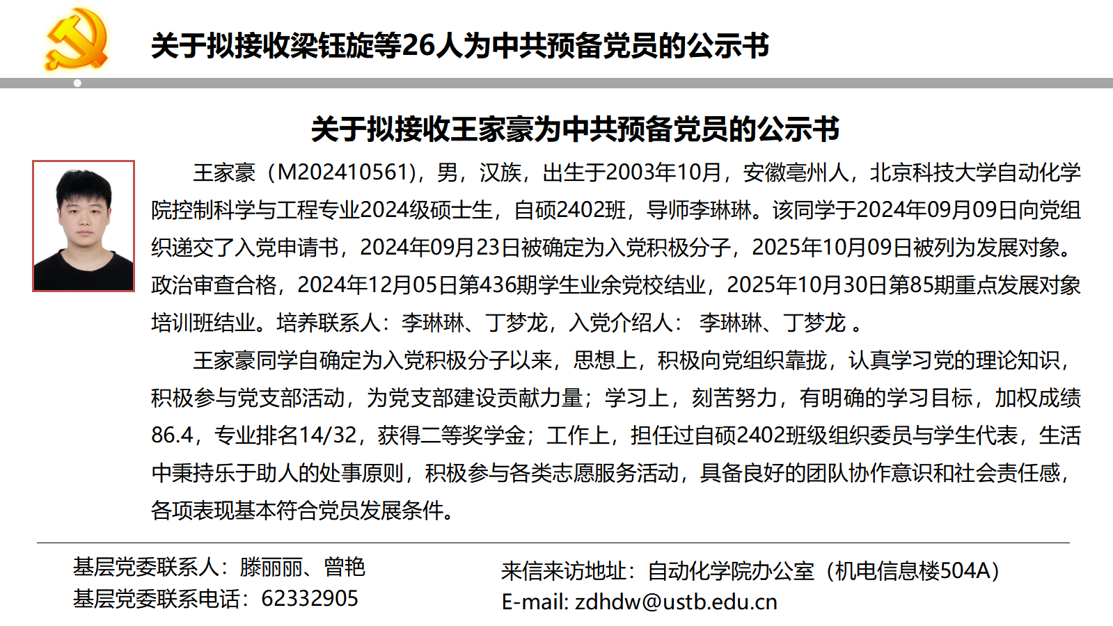 关于拟接收梁钰旋等26人为中共预备党员的公示书