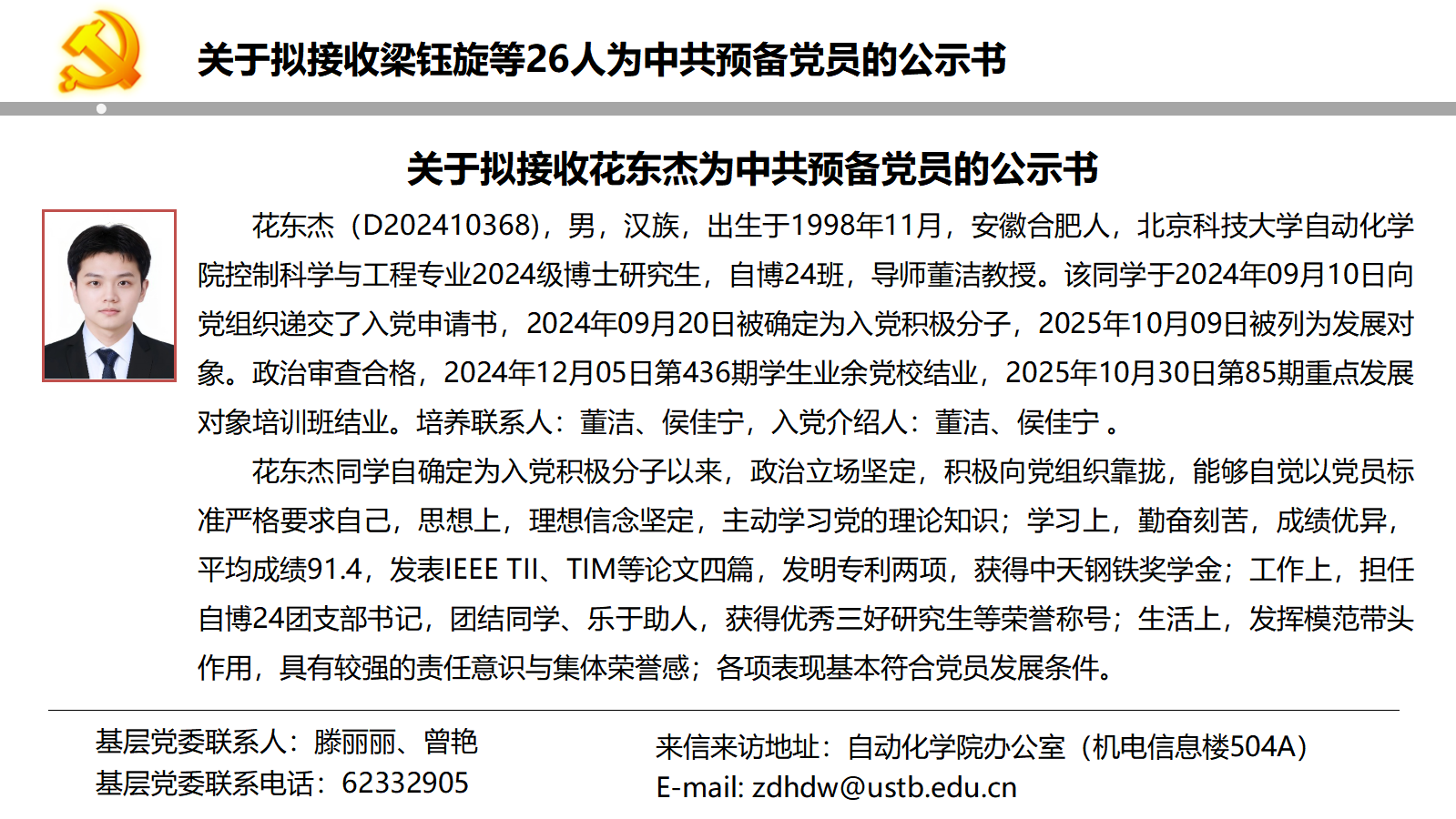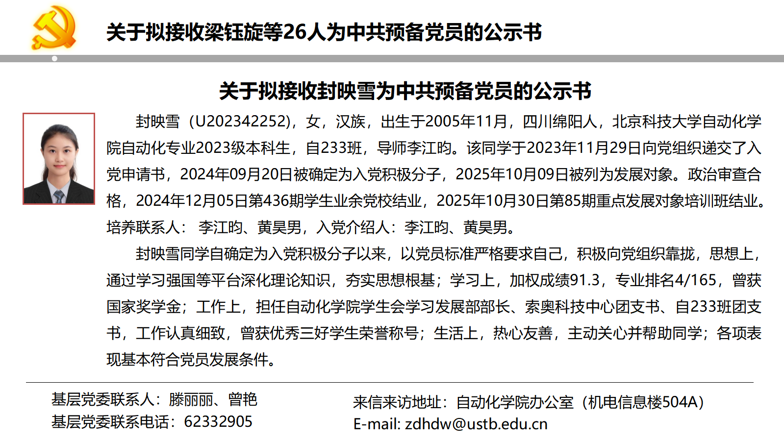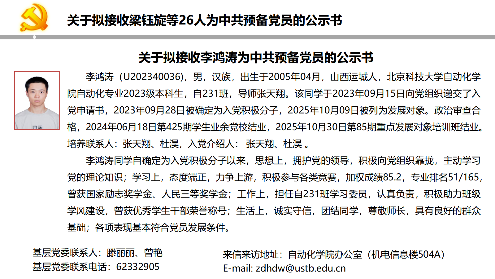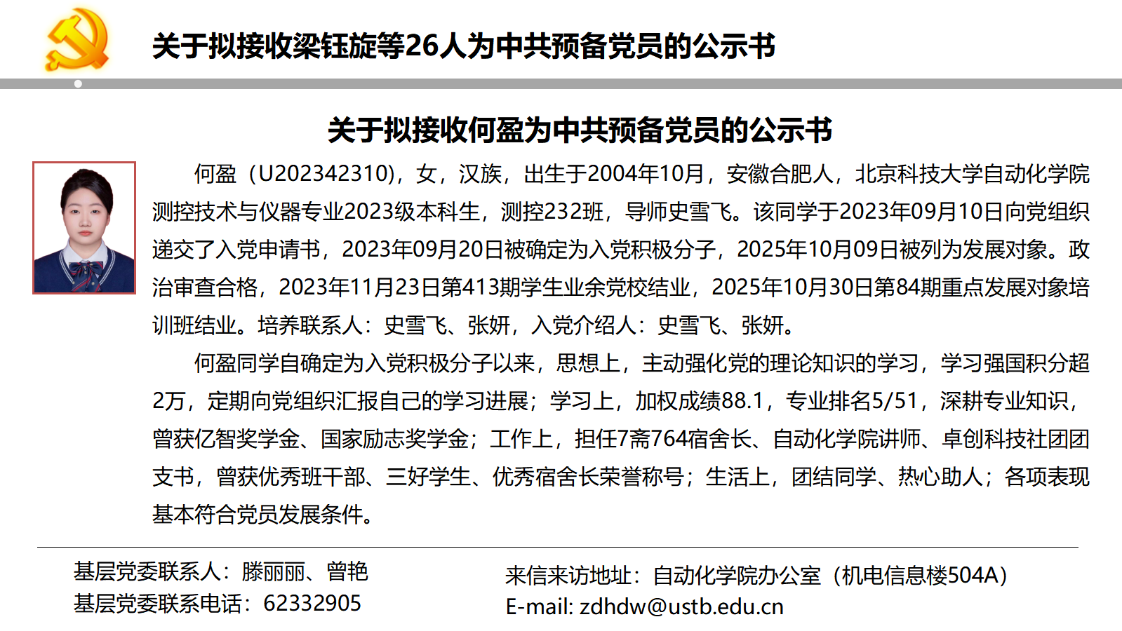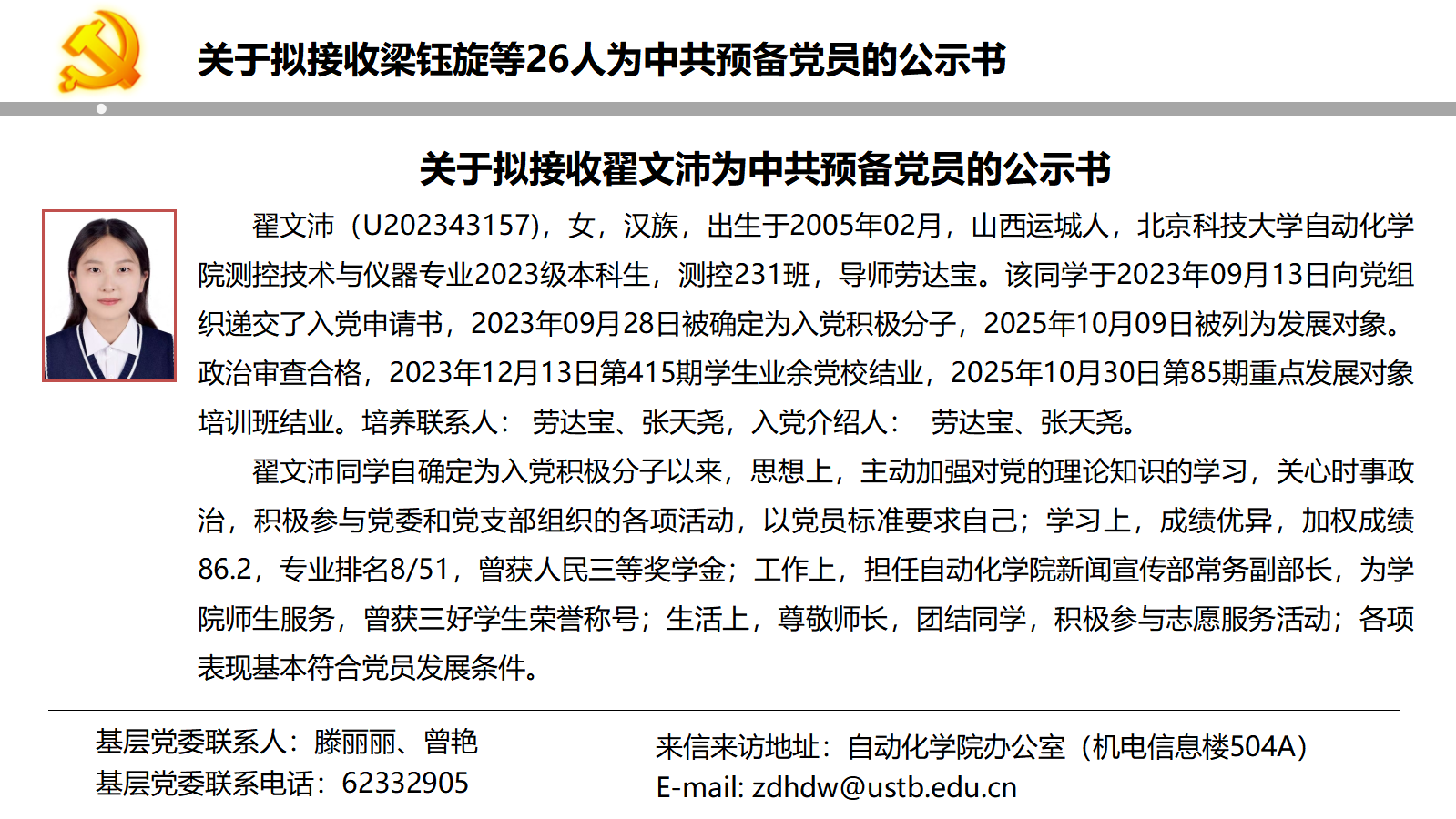 关于拟接收梁钰旋等26人为中共预备党员的公示书